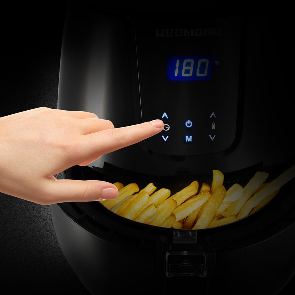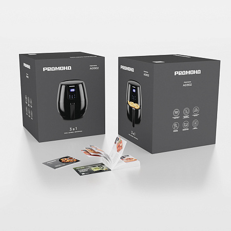 РЕДМОНД AG1902 — аэрогриль 3 в 1 с функциями гриля, духовки и фритюрницы. Подходит для запекания хрустящего картофеля фри, морепродуктов, выпечки и других блюд — у него 7 автоматических программ. Приготовление происходит при помощи конвекции Turbo Cycle: потоки раскаленного воздуха обдувают продукт. Антипригарное покрытие не позволит ломтикам пригореть, а вы сможете готовить без лишнего жира.