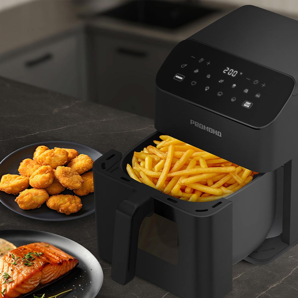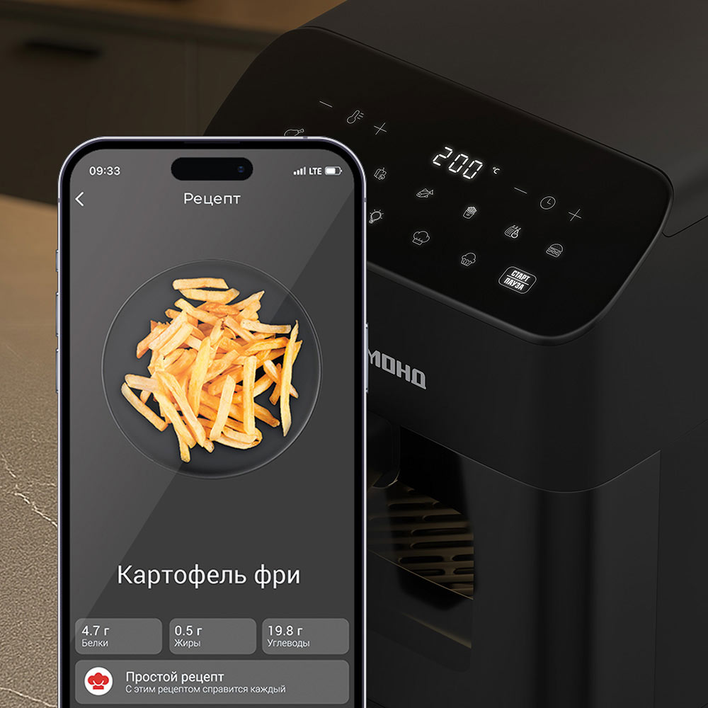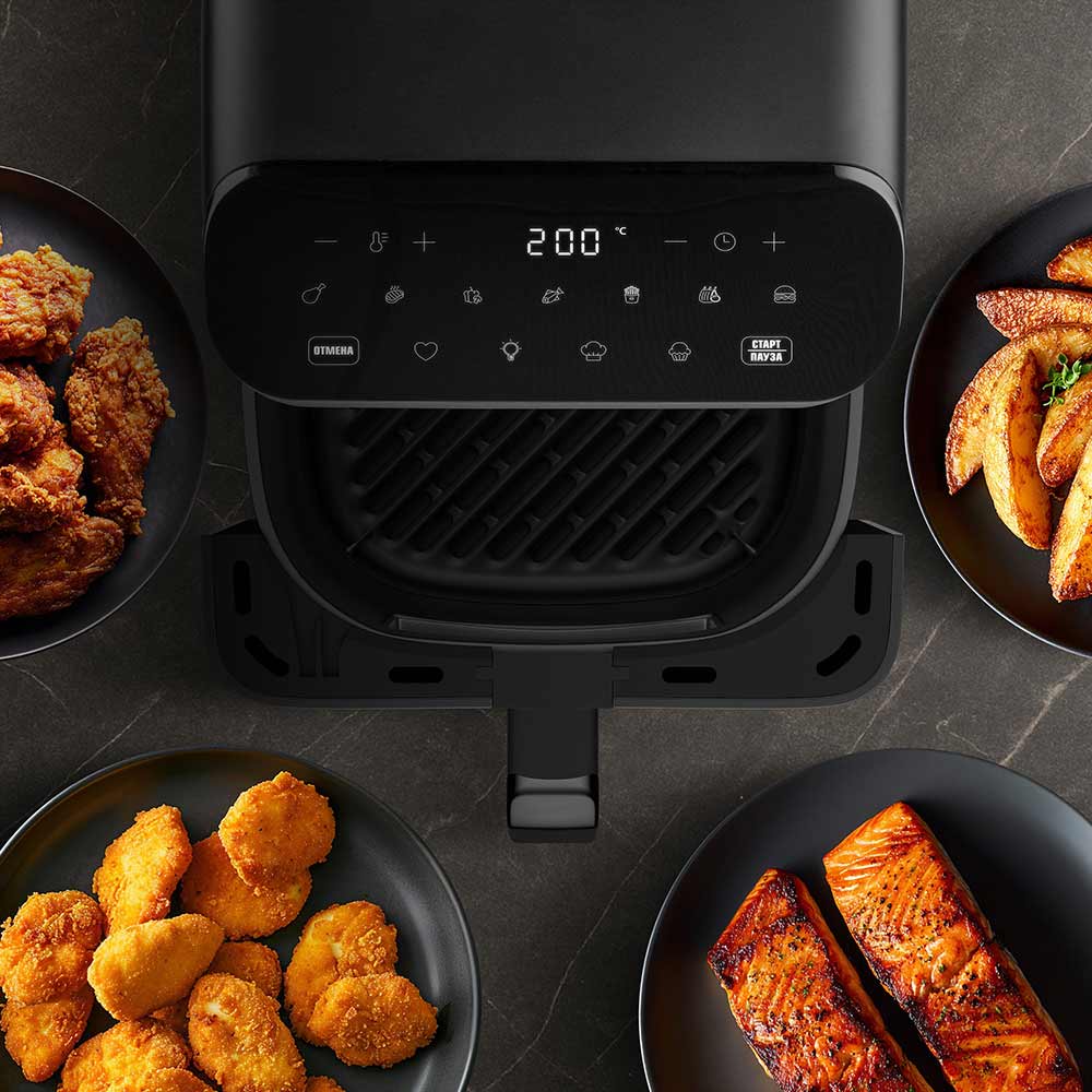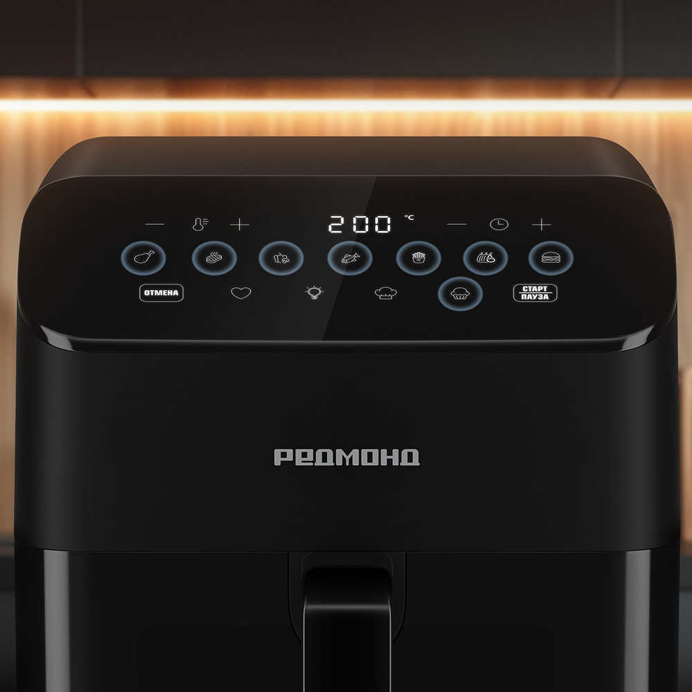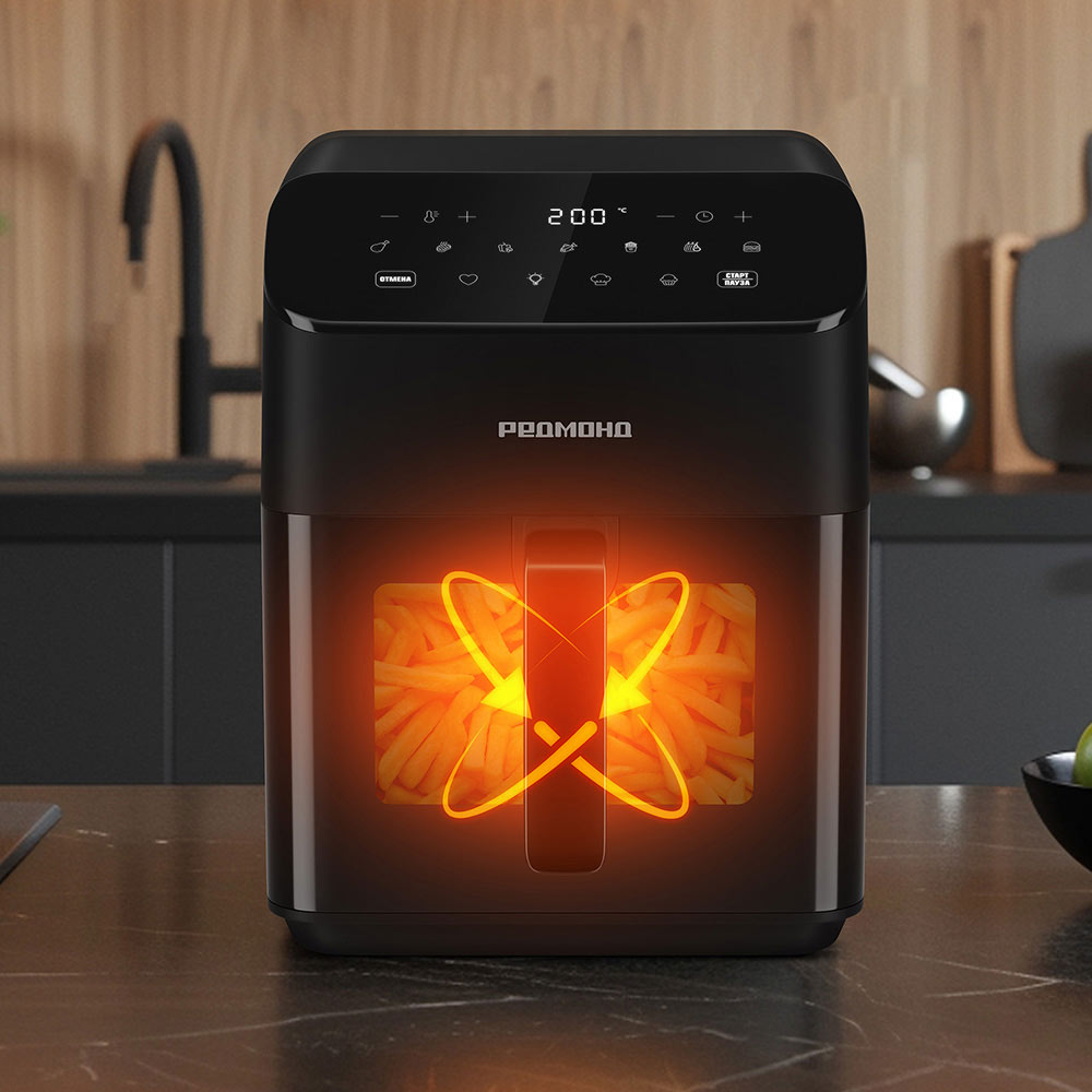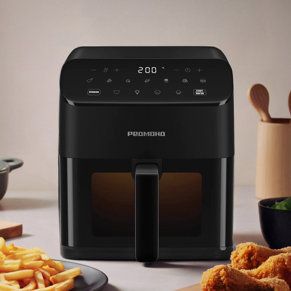Аэрогриль РЕДМОНД AG1905 — универсальный прибор 3 в 1 (гриль, духовка, фритюрница) с увеличенной чашей на 7 литров. В нем вы легко запечете целую курицу или приготовите большие порции гарнира для всей семьи. Технология Turbo Cycle обеспечивает равномерное пропекание и позволяет готовить без использования масла. Удобное сенсорное управление, 8 автопрограмм и ручной режим позволяют легко контролировать процесс, а идеи для новых блюд — всегда под рукой в приложении REDMOND Шеф.