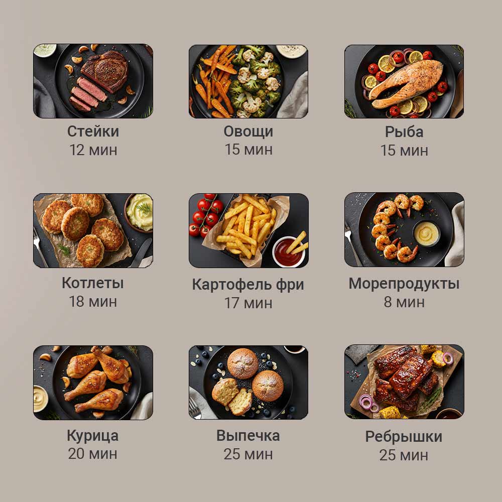 Установите точную температуру от 50 до 200 °C и время до 60 минут, чтобы повторить рецепт из кулинарного блога или создать свой. Ручной режим отлично подходит для нежных омлетов, румяных сырников, мини-пицц с хрустящим краем или насыщенных брауни. Вы контролируете процесс, а аэрогриль обеспечивает точное соблюдение заданных параметров.