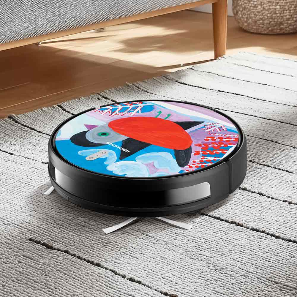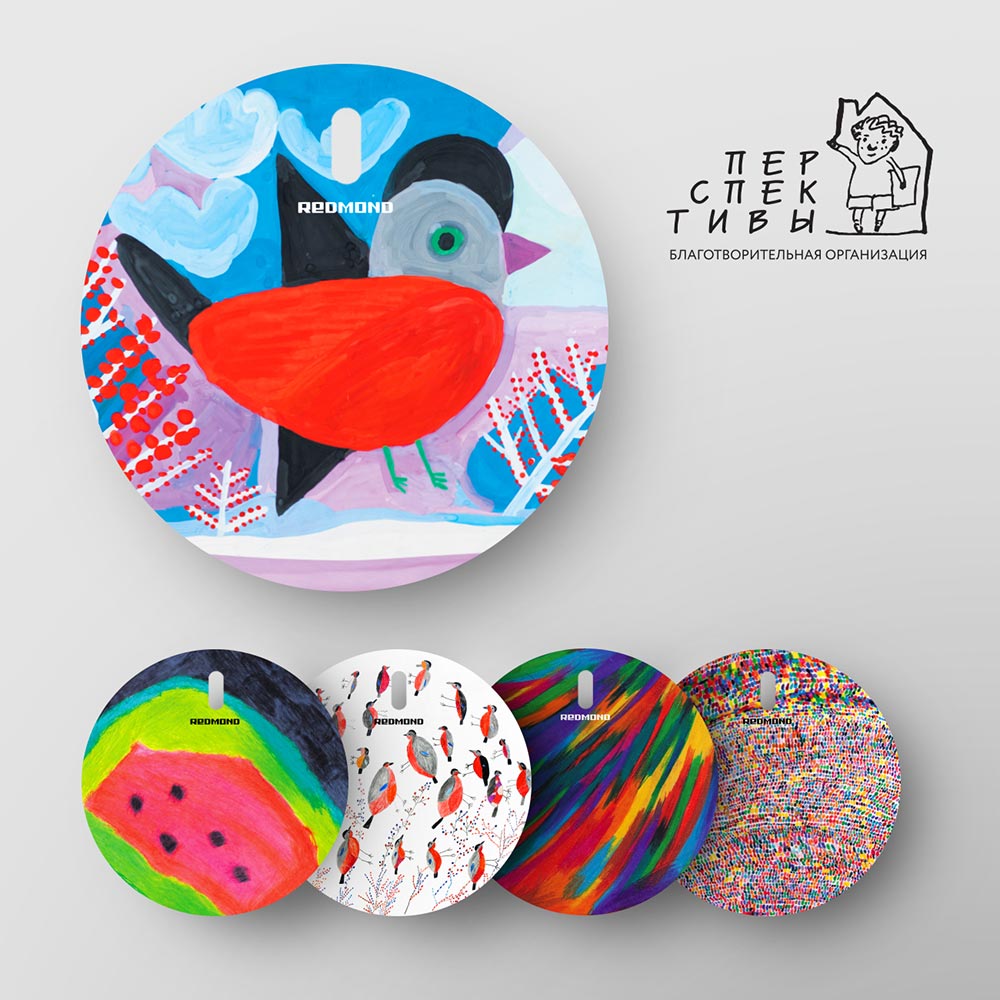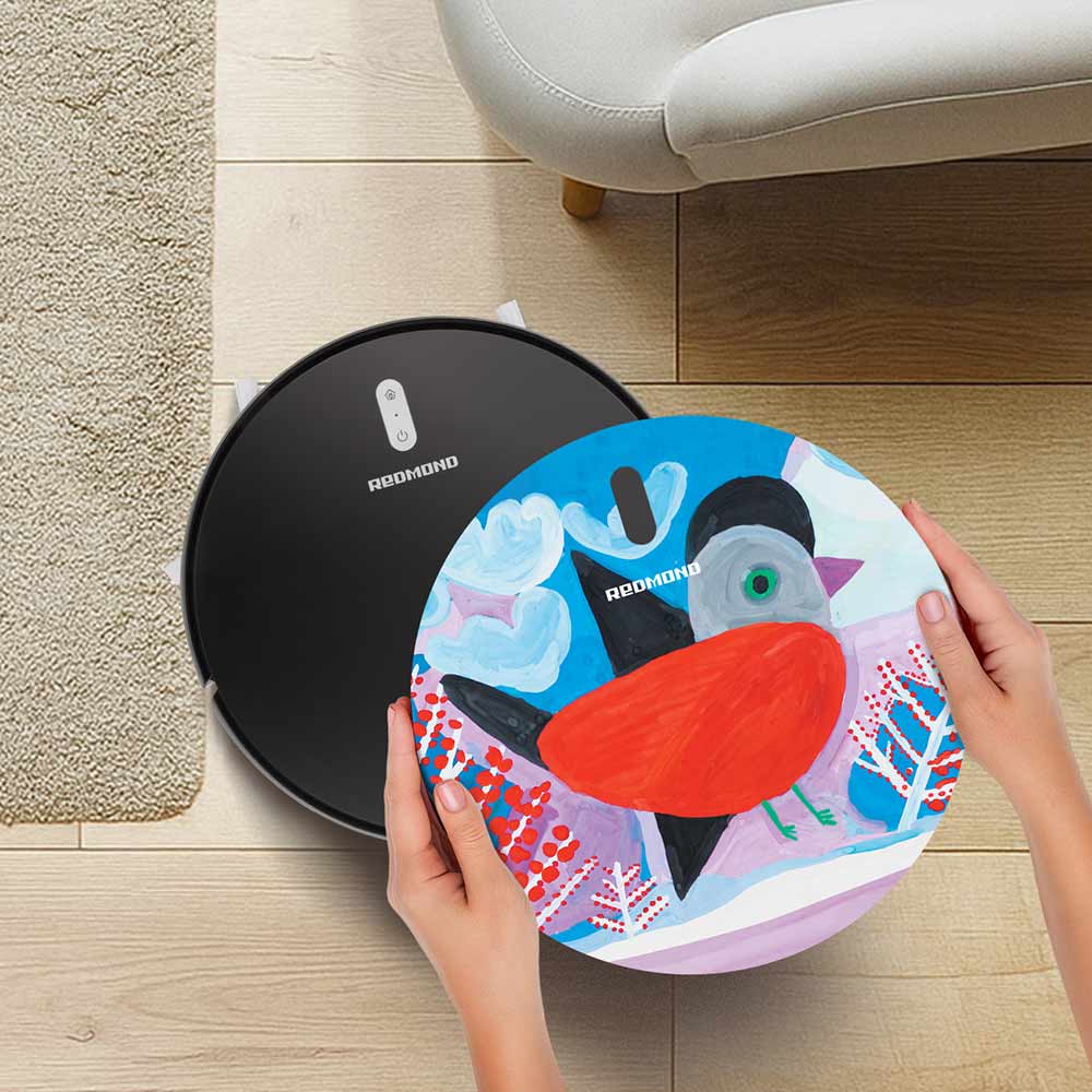 VRC1302 — съемная верхняя панель для умного робота-пылесоса RV-R630S. Рисунок на ней выполнен подопечным благотворительной организации «Перспективы». Благодаря съемной конструкции (ее механизм запатентован REDMOND*) крышки можно менять, когда захочется.