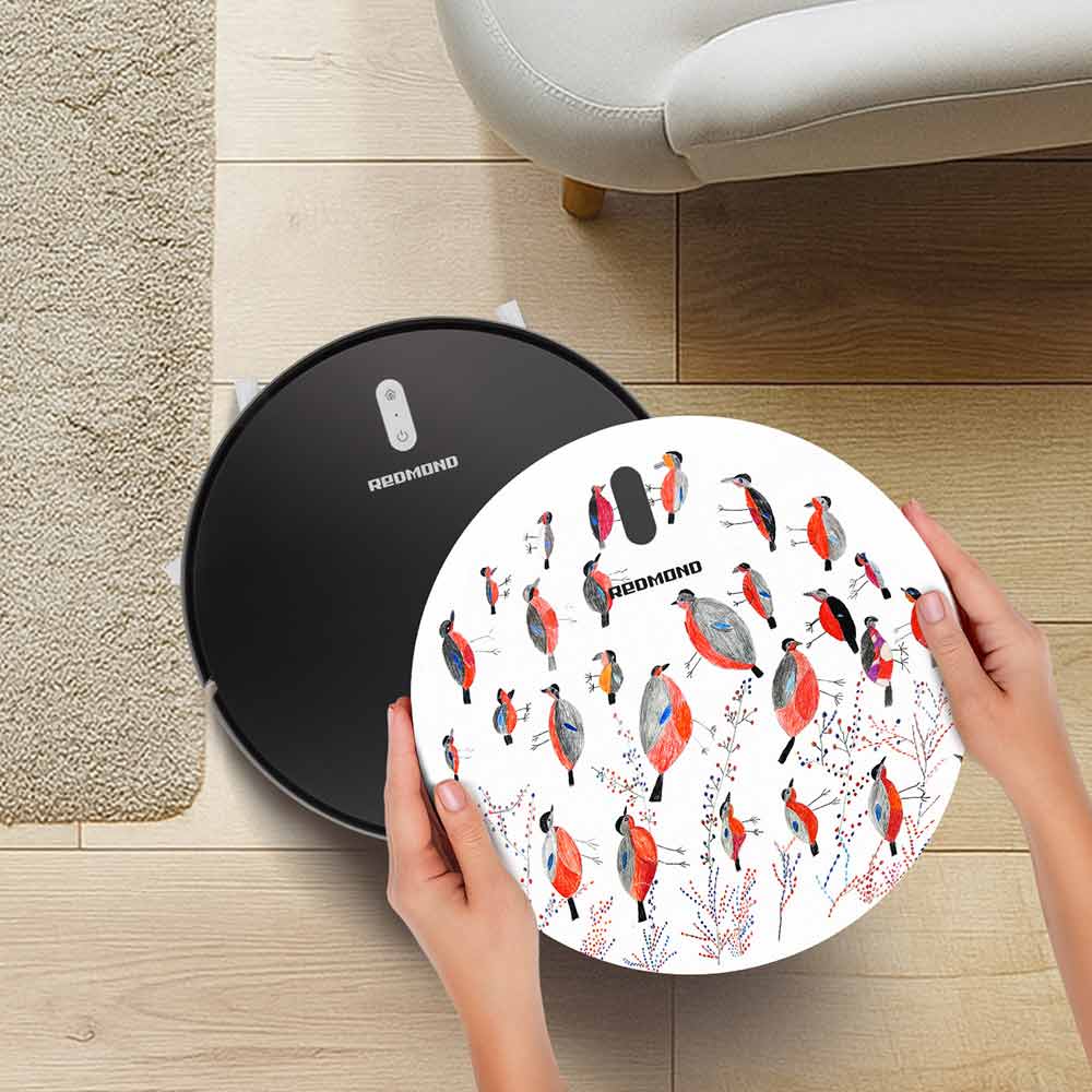 Панель VRC1305 — это новый продукт REDMOND. Съемная крышка предназначена для робота-пылесоса RV-R630S. Изображение для нее, как и для ряда других панелей, выполнено в коллаборации с благотворительной организацией «Перспективы»: автором выступила художница-подопечная фонда.*