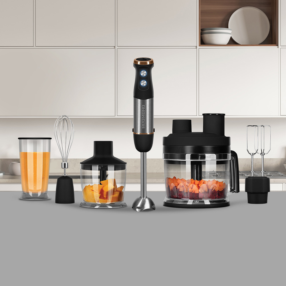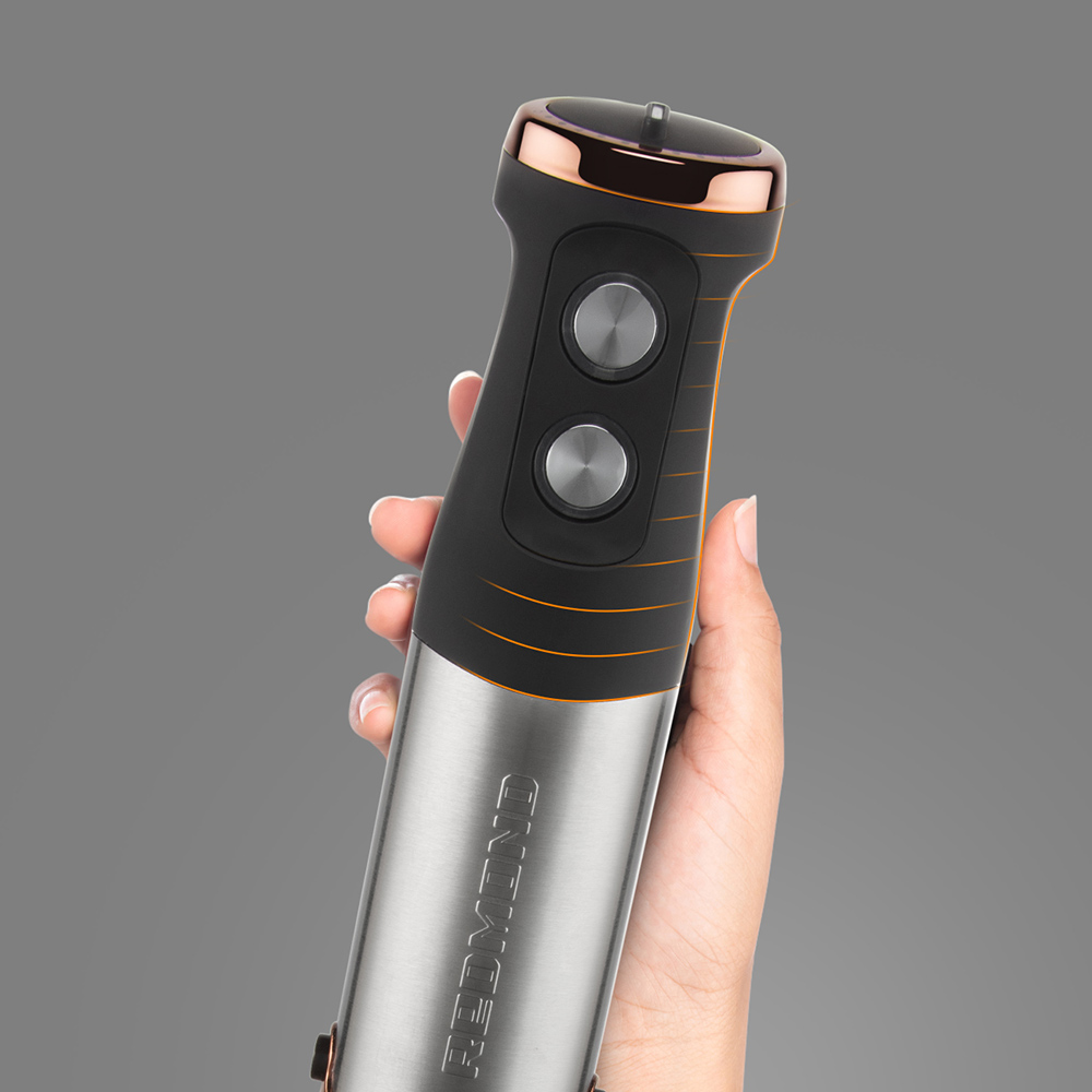 Блендер РЕДМОНД BH408 — эргономичный прибор с мощностью 1500 Вт для приготовления разнообразных блюд дома. Мультиустройство 9 в 1 может самостоятельно смешивать, шинковать, блендировать, взбивать и даже нарезать. А для любителей утром насладиться нежным капучино в комплекте идет вспениватель для молока.