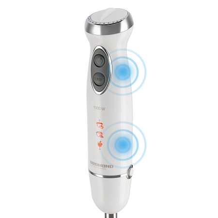 Основная скорость работы RHB-2989 плавно регулируется в диапазоне от 9000 до 15000 об/мин. Чтобы наиболее тщательно обработать продукты, постепенно увеличивайте скорость вращения насадок при помощи переключателя на ручке прибора. Завершить приготовление можно в режиме «Турбо»: кратковременное увеличение скорости до 16 000 об\мин позволяет избавиться от мельчайших комочков в тесте, кусочков овощей в пюре и взбить стойкую белковую пену.