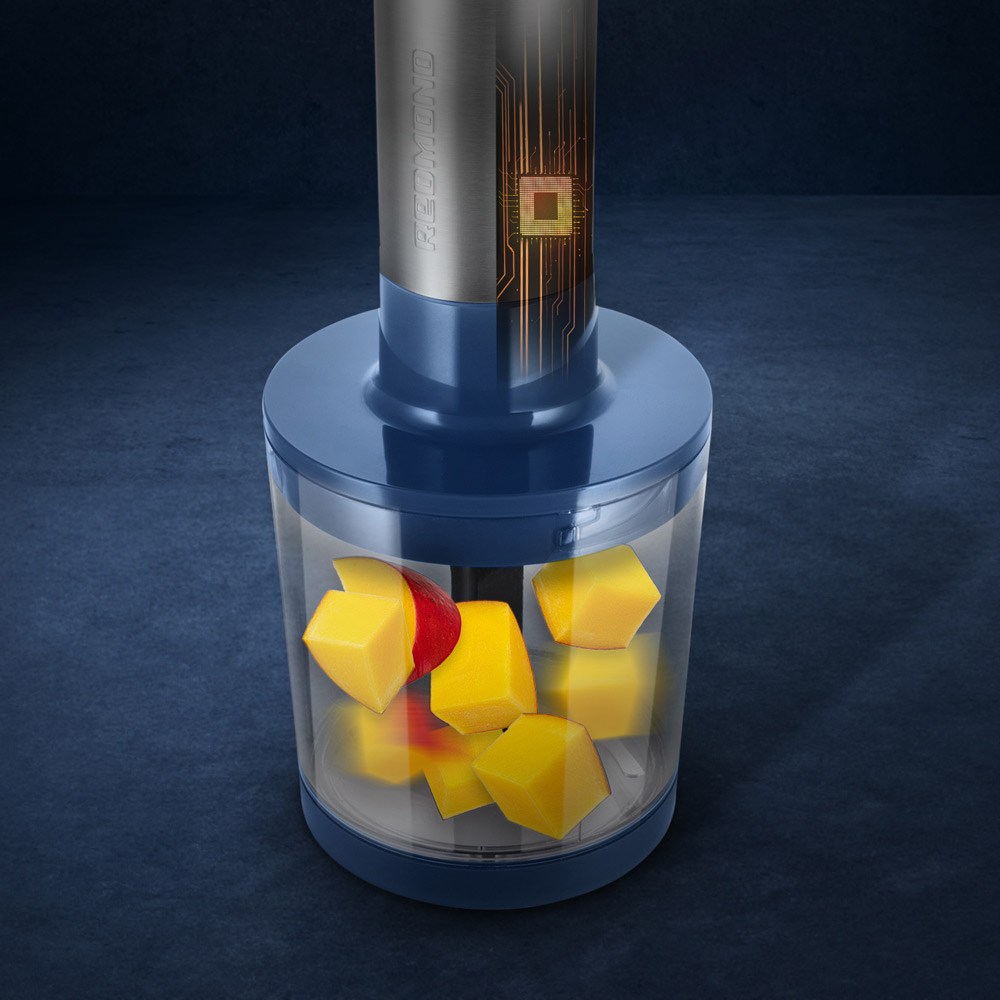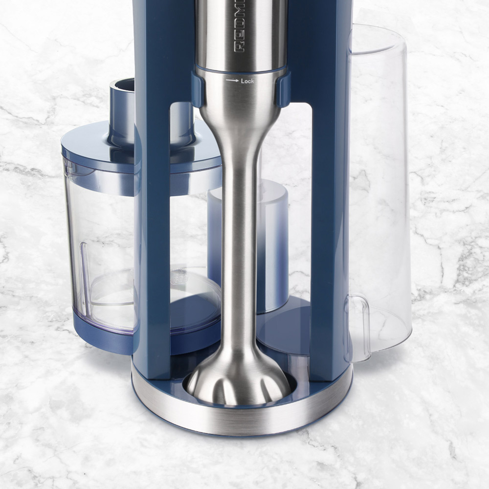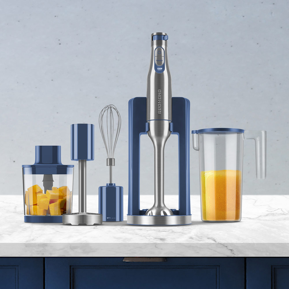 Блендер РЕДМОНД BH402 – многофункциональный прибор, который поможет вам в приготовлении супа, коктейлей или соусов, сделает фарш из курицы и тесто для вафель. Вертикальная база для хранения вмещает блендер со всеми насадками, поэтому на кухне не будет беспорядка.