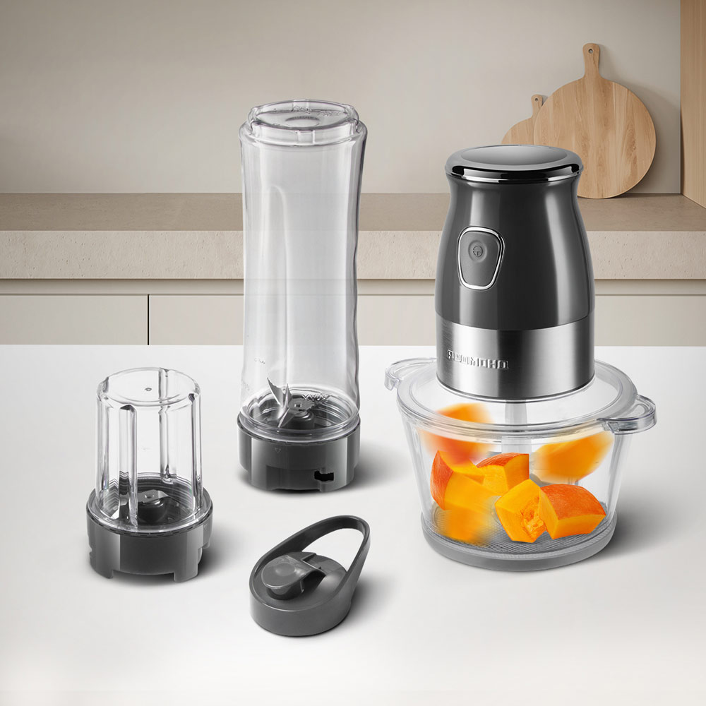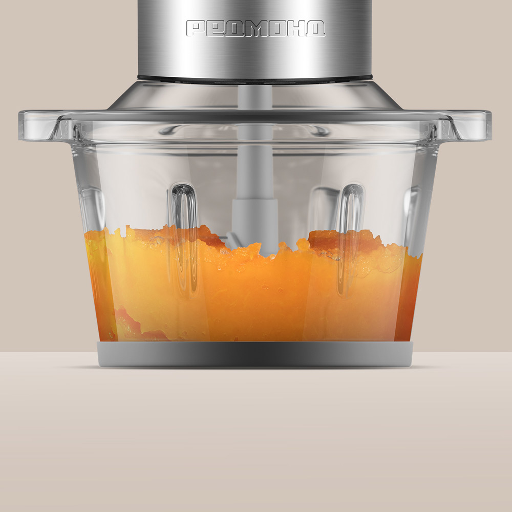 Измельчитель РЕДМОНД CR2701 с 4 лезвиями из прочной стали быстро измельчит сырые и вареные овощи, мясо и орехи. Также его можно использовать как блендер и кофемолку: приготовить паштет, суп-пюре, специи из трав и сделать молотый кофе. Основная чаша объемом 2 литра изготовлена из стекла. А двигатель имеет защиту от перегрева.