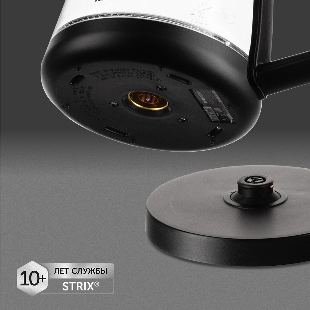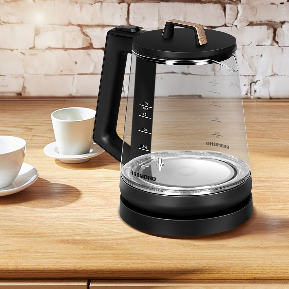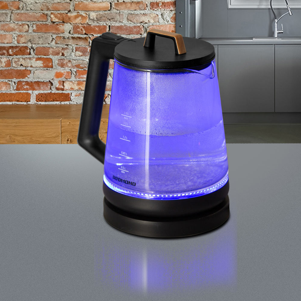 REDMOND KG226 — чайник объемом 1,7 литра с эксклюзивным дизайном в стиле лофт. Имеет колбу из термостойкого стекла и удобную съемную крышку. Оснащен системой защиты и автоматически отключается при закипании и отсутствии воды. Надежная контактная группа Striх® прослужит более 10 лет.