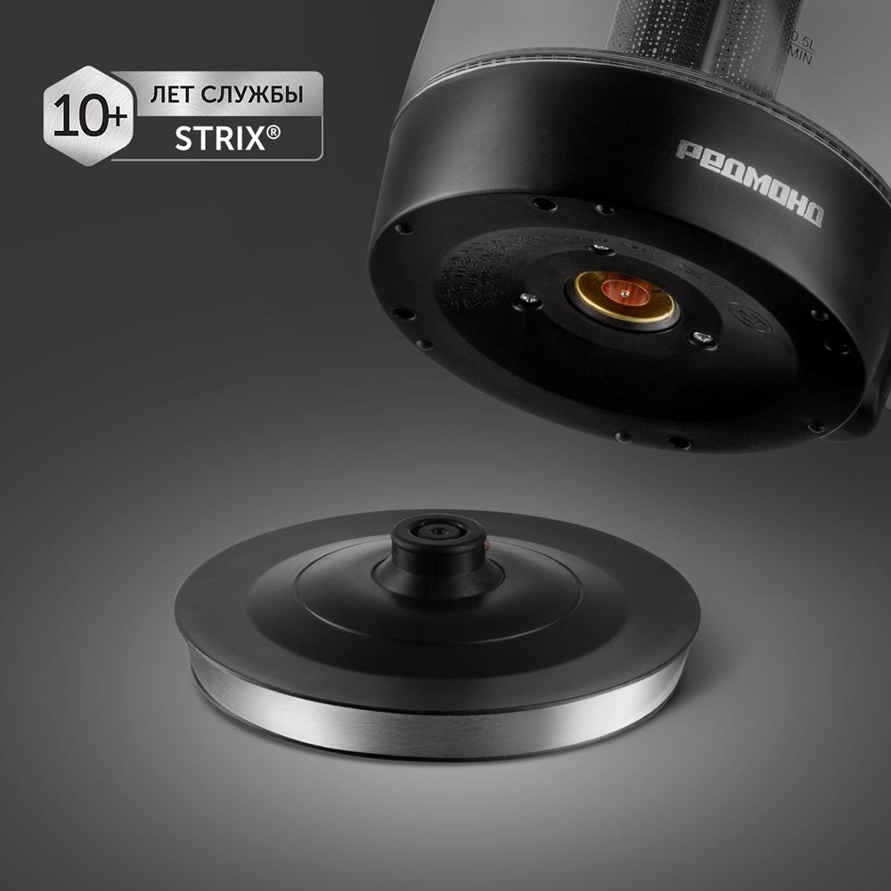 Чайник РЕДМОНД KG227 станет стильным дополнением любого интерьера и впечатлит настоящих ценителей горячих напитков. Его колба выполнена из термостойкого стекла, прочного и безопасного для использования. Прибор также оснащен надежной контактной группой Strix®, которая автоматически отключает устройство и не позволяет ему перегреваться.