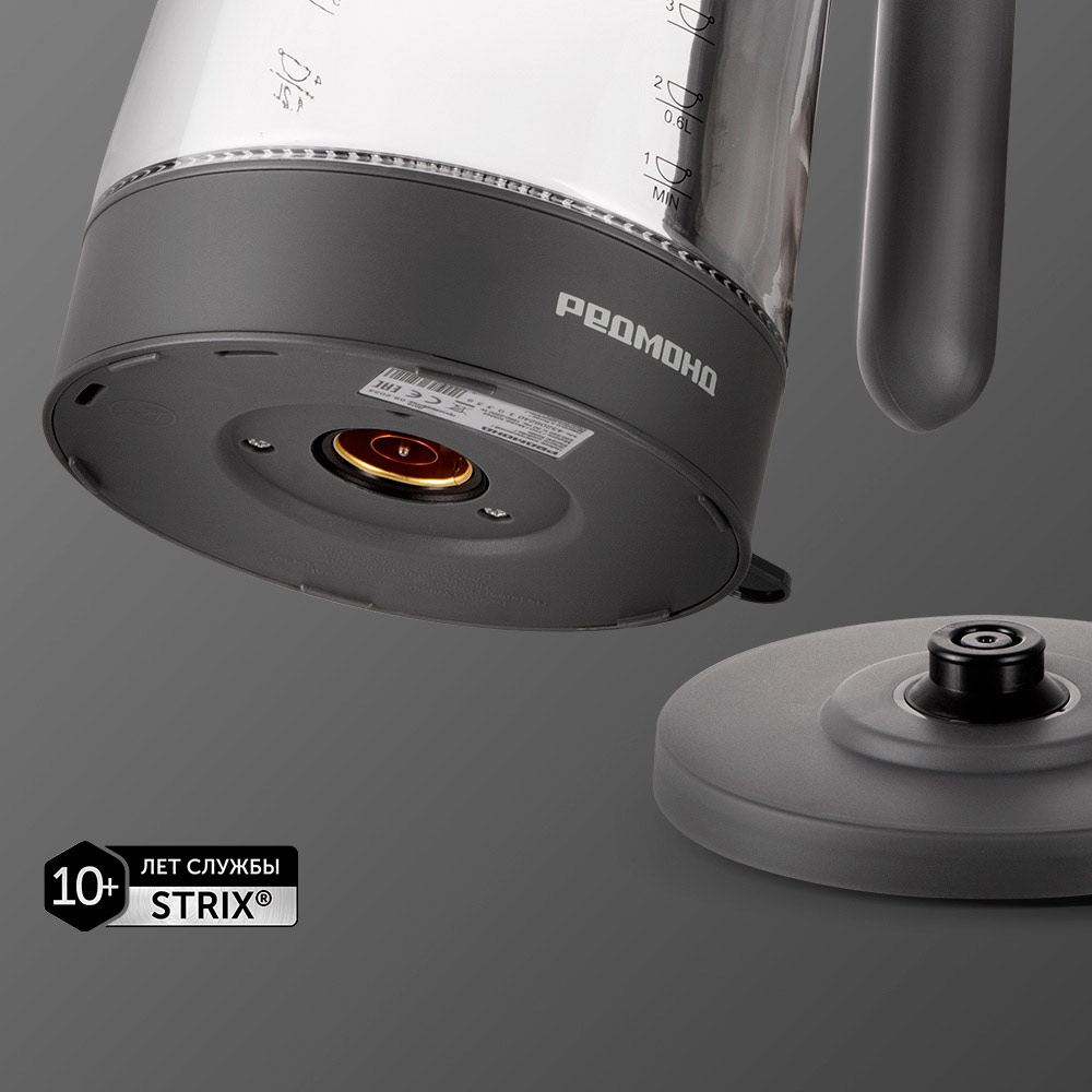 Чайник РЕДМОНД KG252 со стеклянной термостойкой колбой и подсветкой дополнит любой кухонный интерьер. Объема 1,7 литра хватит, чтобы приготовить 6–7 чашек ароматного чая. Чайник удобно использовать: облегченный корпус и эргономичная ручка не дадут устать руке. А контактная группа Strix® и опция автоотключения продлят срок службы чайника.