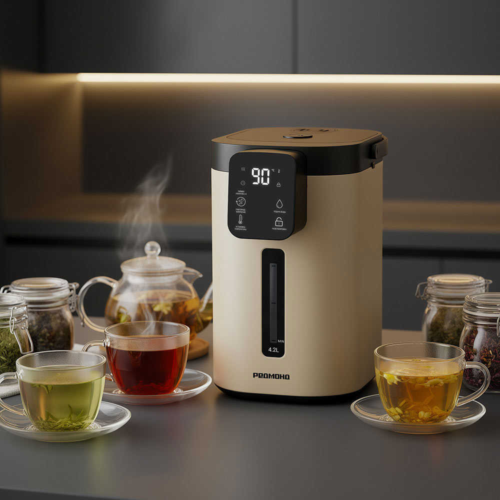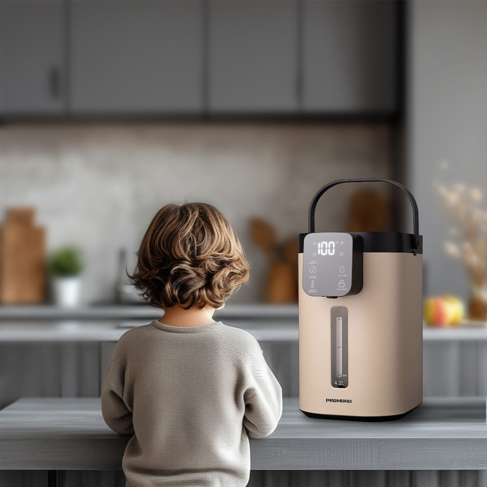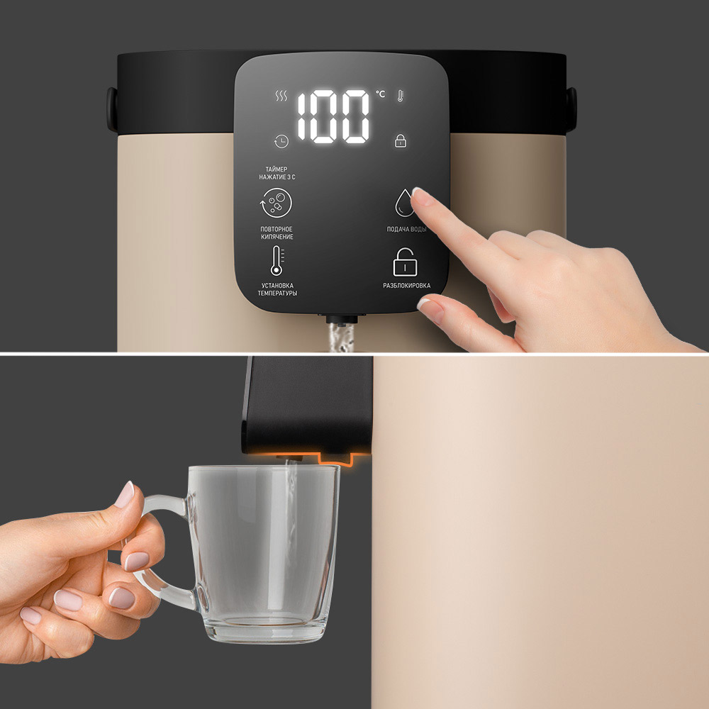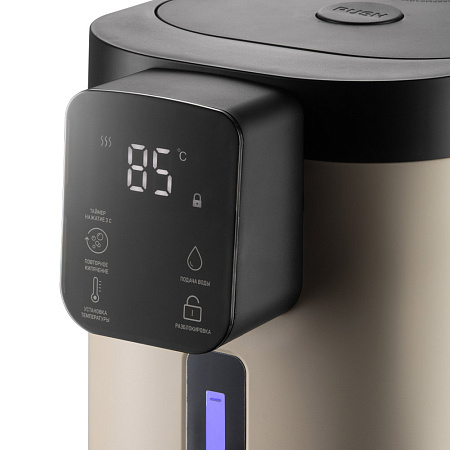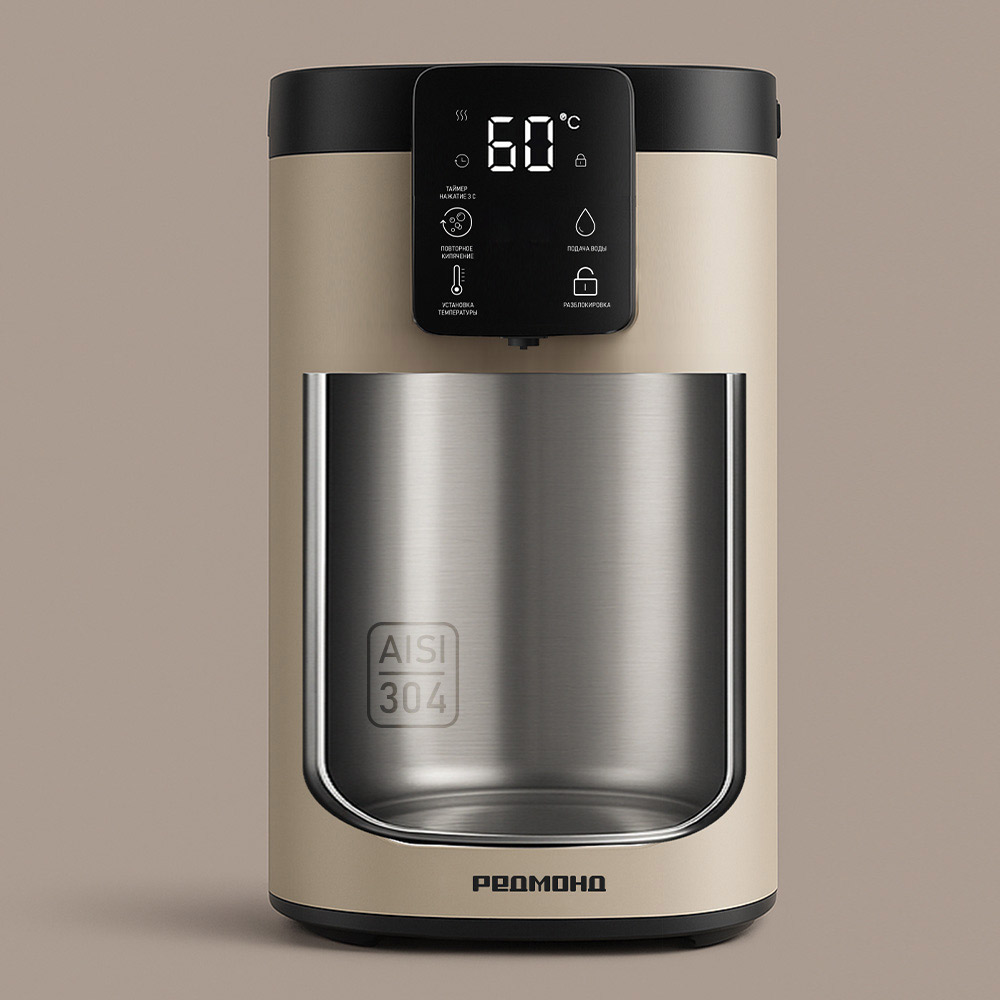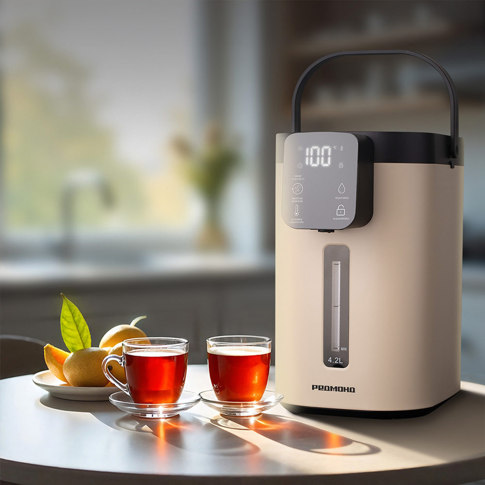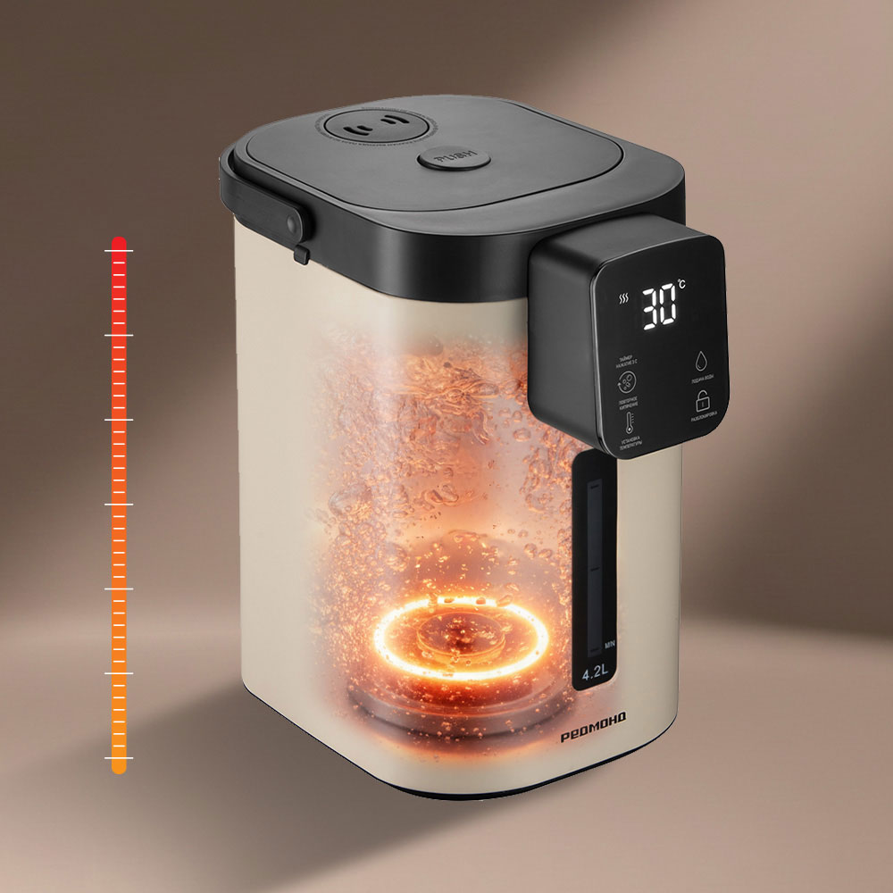 РЕДМОНД TP2300 — компактный термопот в стильном металлическом корпусе объемом 4,2 л. 11 температурных режимов позволяют поддерживать температуру воды в диапазоне от 40 до 90 °С. Благодаря двойным стенкам корпус не нагревается, а бак из нержавеющей стали обеспечивает долгий срок службы. Для безопасного использования предусмотрена защита от перегрева и блокировка подачи воды.
