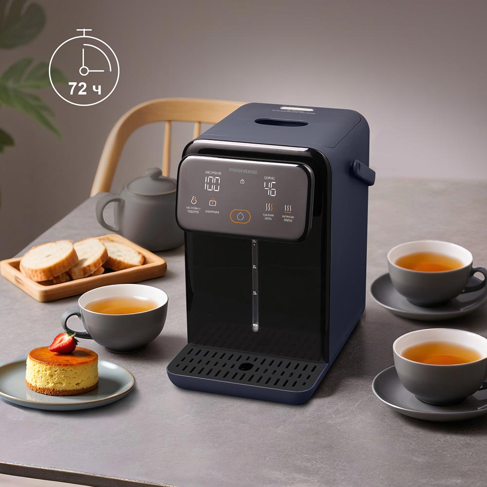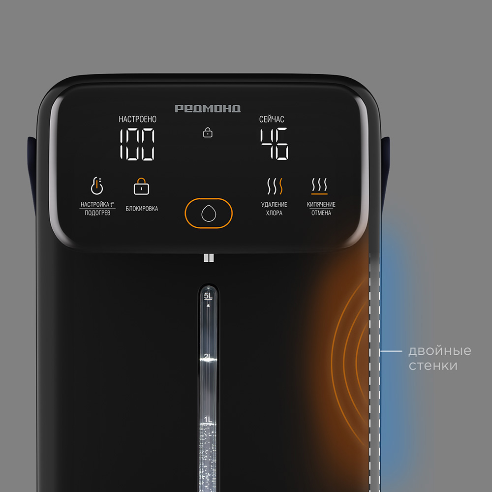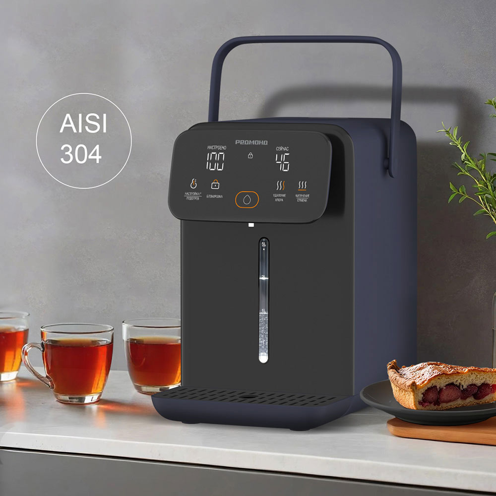 РЕДМОНД TP2302 — термопот объемом 5 литров в стильном синем оттенке с сенсорным дисплеем. Позволяет выбрать оптимальную температуру нагрева воды (от 40 до 95 °С) для любых нужд — от приготовления детского питания до заваривания любимого чая. С TP2302 можно наслаждаться вкусными и очищенными от вредных веществ напитками даже при использовании водопроводной воды: функция длительного кипячения снижает содержание хлора и помогает избавиться от примесей. Адиабатный корпус с двойными стенками защищает от случайных ожогов и удерживает тепло дольше, а резервуар из нержавеющей стали AISI 304 устойчив к высоким температурам и коррозии, что гарантирует его надежность и долговечность.