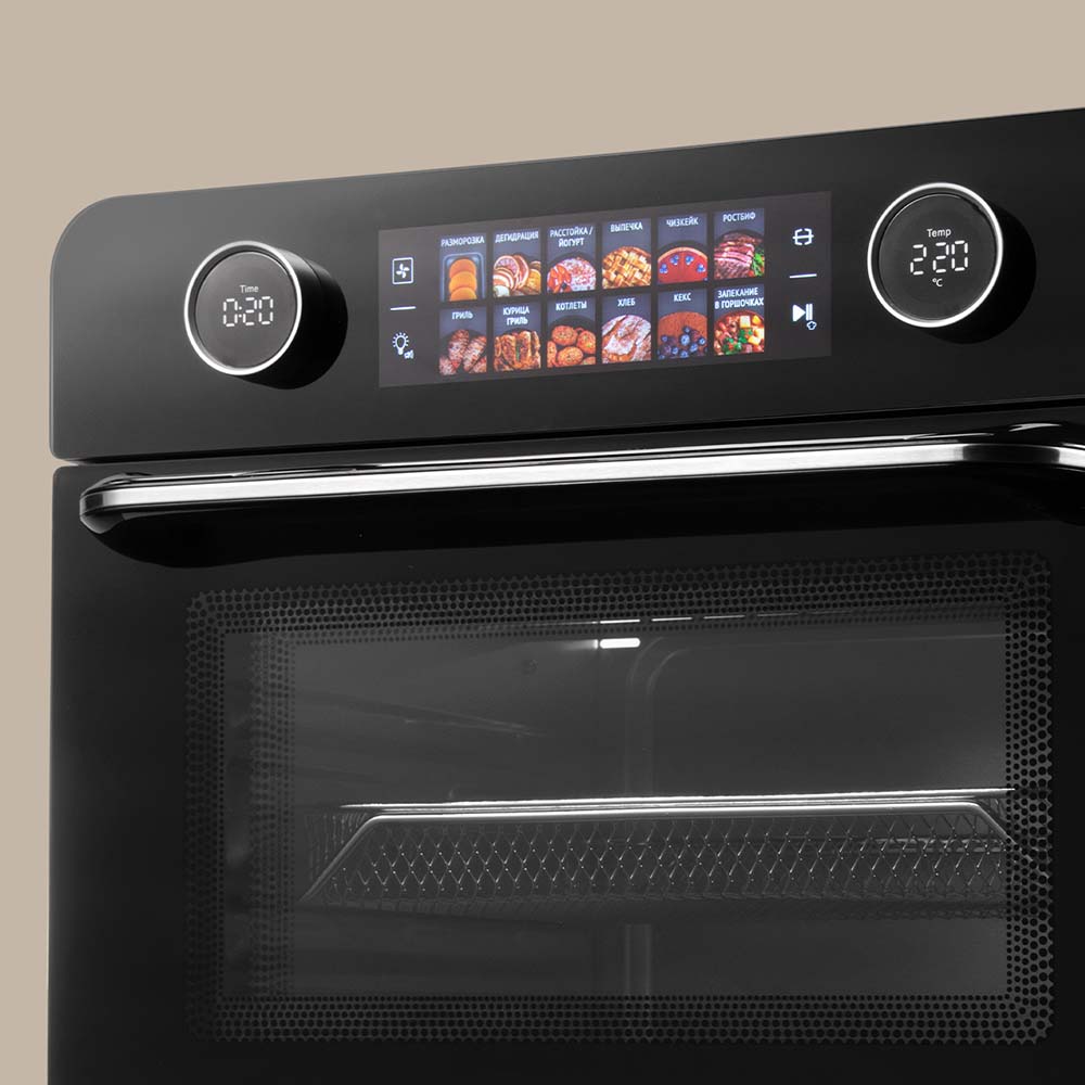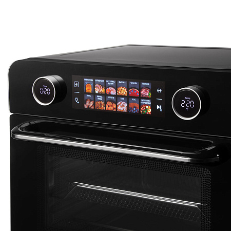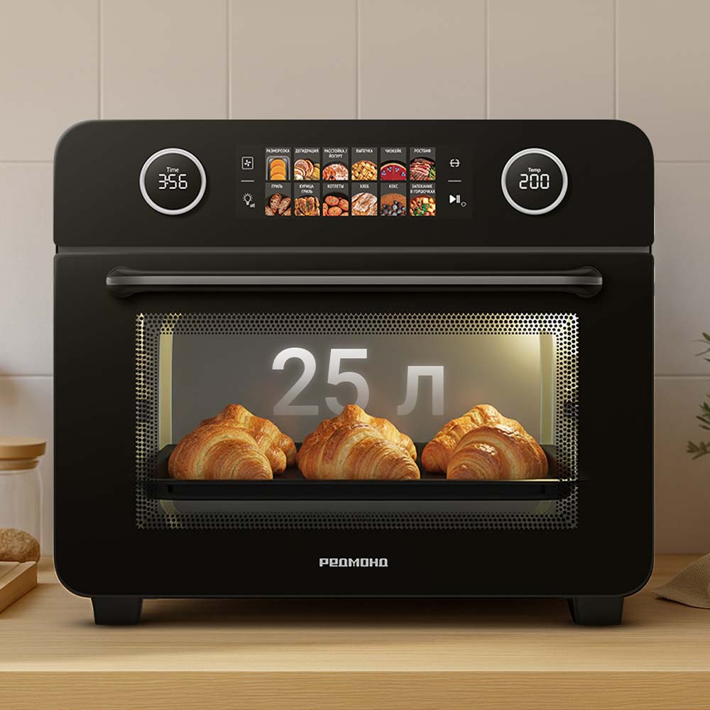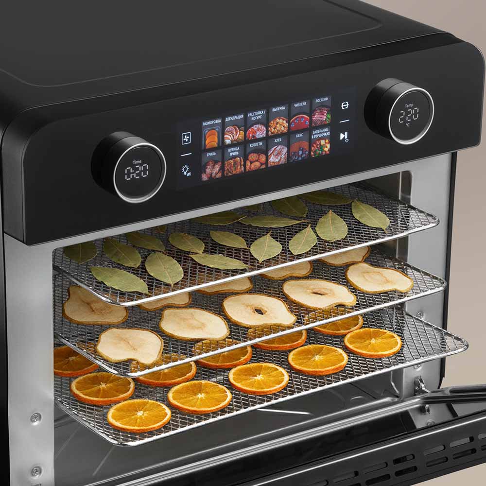 Шкаф духовой РЕДМОНД OV2100 с функциями аэрогриля и дегидратора. Прибор оснащен функцией гриля и вертелом. Мультиконвекция равномерно распределяет горячий воздух, благодаря чему продукты получаются хрустящими снаружи и мягкими внутри. В комплект входят 3 решетки для сушки фруктов, овощей и трав. Устройство имеет 12 автоматических режимов и ручную настройку температуры (35–230 °C) и времени (до 9,5 часов). Предусмотрены режимы верхнего, нижнего и комбинированного нагрева. Объем камеры — 25 литров, что делает модель подходящей для всей семьи при компактных габаритах корпуса.
