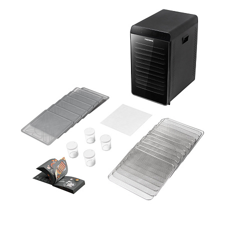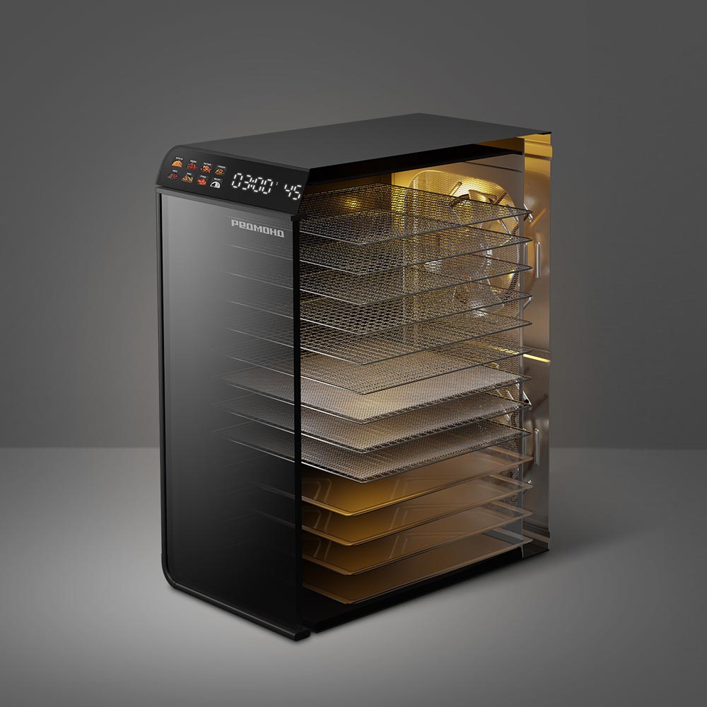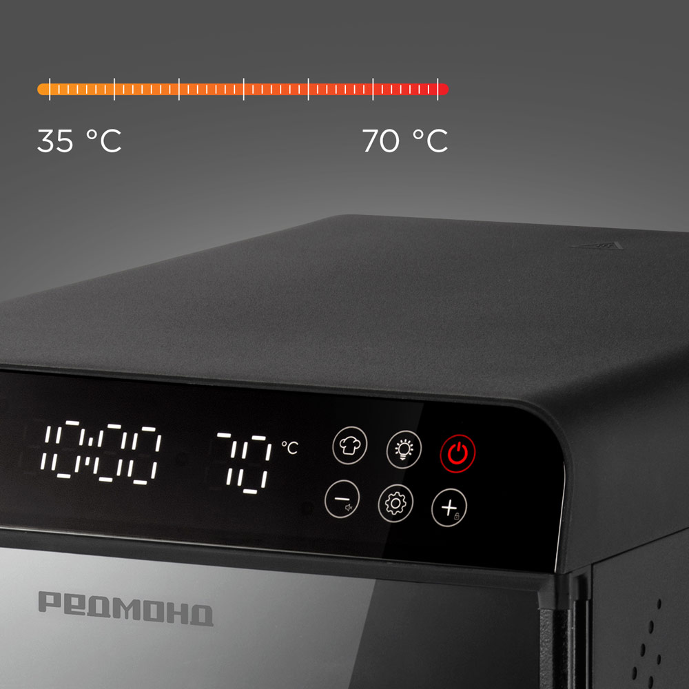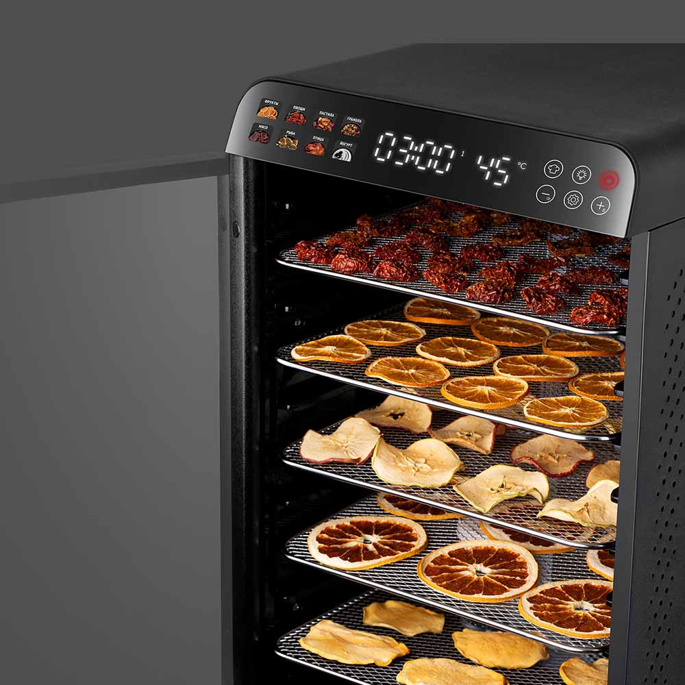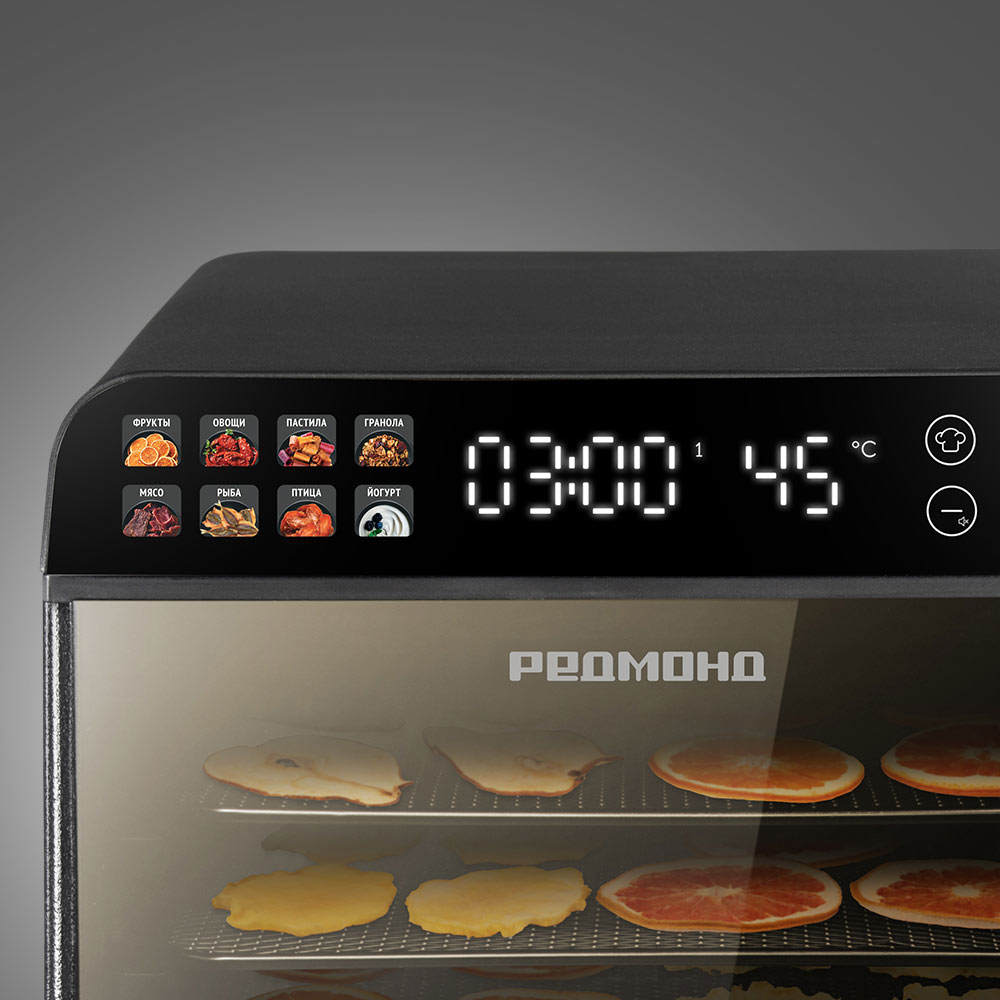 РЕДМОНД FD1104 — вместительный и технологичный дегидратор для бережной сушки овощей, фруктов, грибов и ягод, а также приготовления пастилы, вяленого мяса, рыбы и домашнего йогурта. Благодаря мощности 1100 Вт, 12 уровням сушки и системе DUALHEAT с двойным горизонтальным обдувом продукты равномерно высушиваются, сохраняя вкус, аромат и витамины. Цветной сенсорный дисплей и 8 автоматических программ делают работу интуитивной, а корпус из нержавеющей стали и продуманный дизайн гарантируют надежность и удобство.
