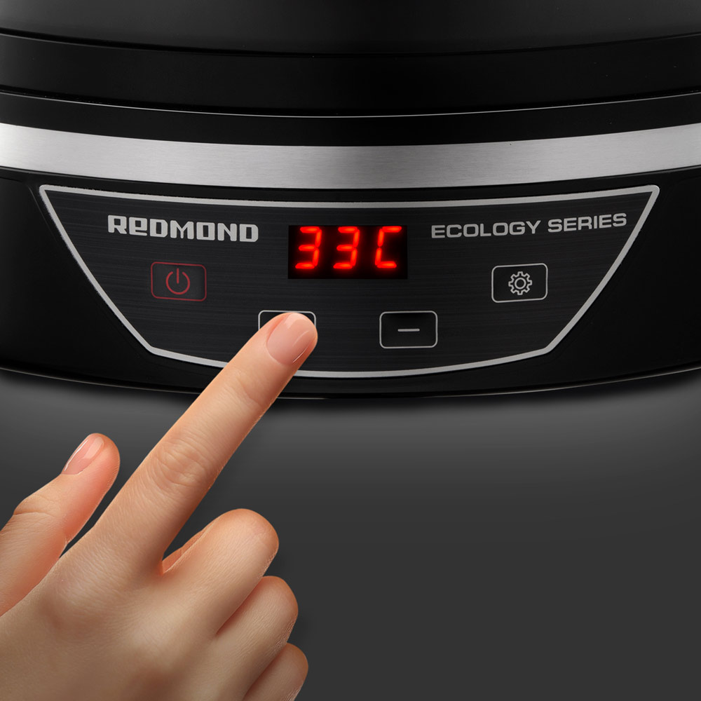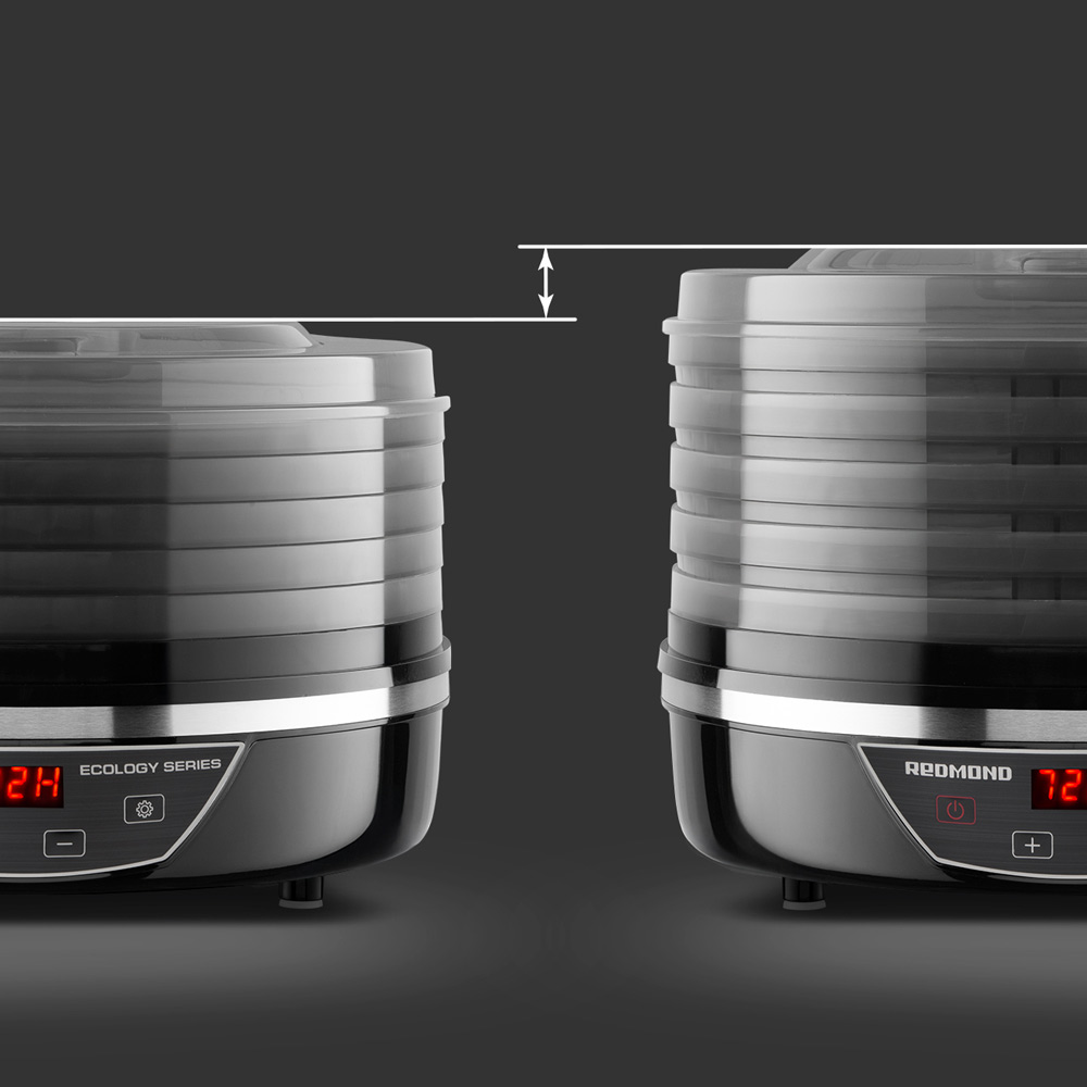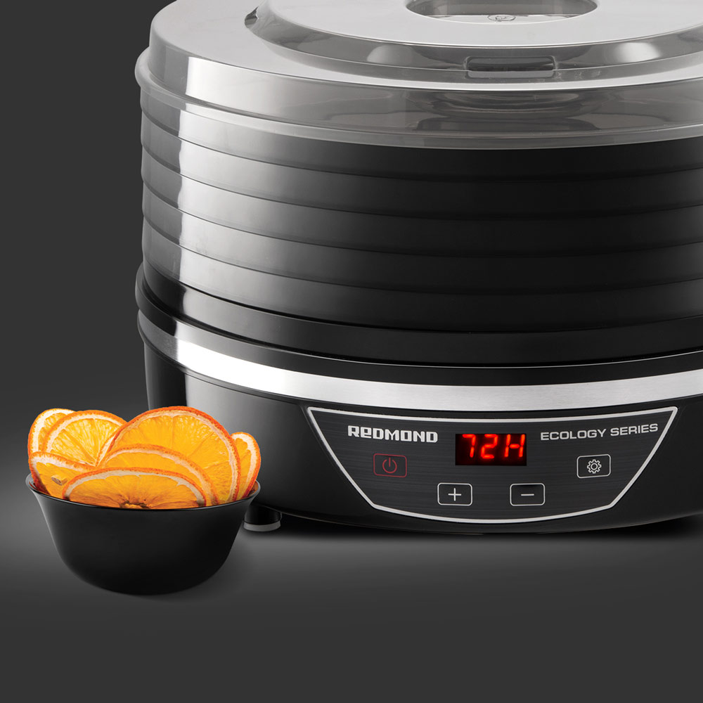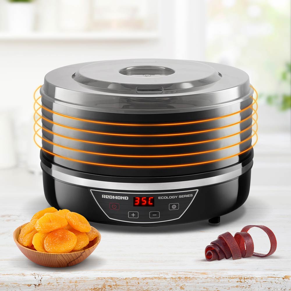 Сушилка, или дегидратор, РЕДМОНД FD1102 – прибор для сушки фруктов и овощей, приготовления специй, приправ, сушеного чая и полезных перекусов. Мощность сушилки 500 Вт. В комплект входят 5 поддонов из прочного термостойкого пластика.