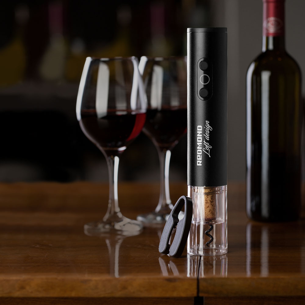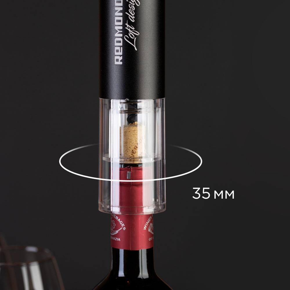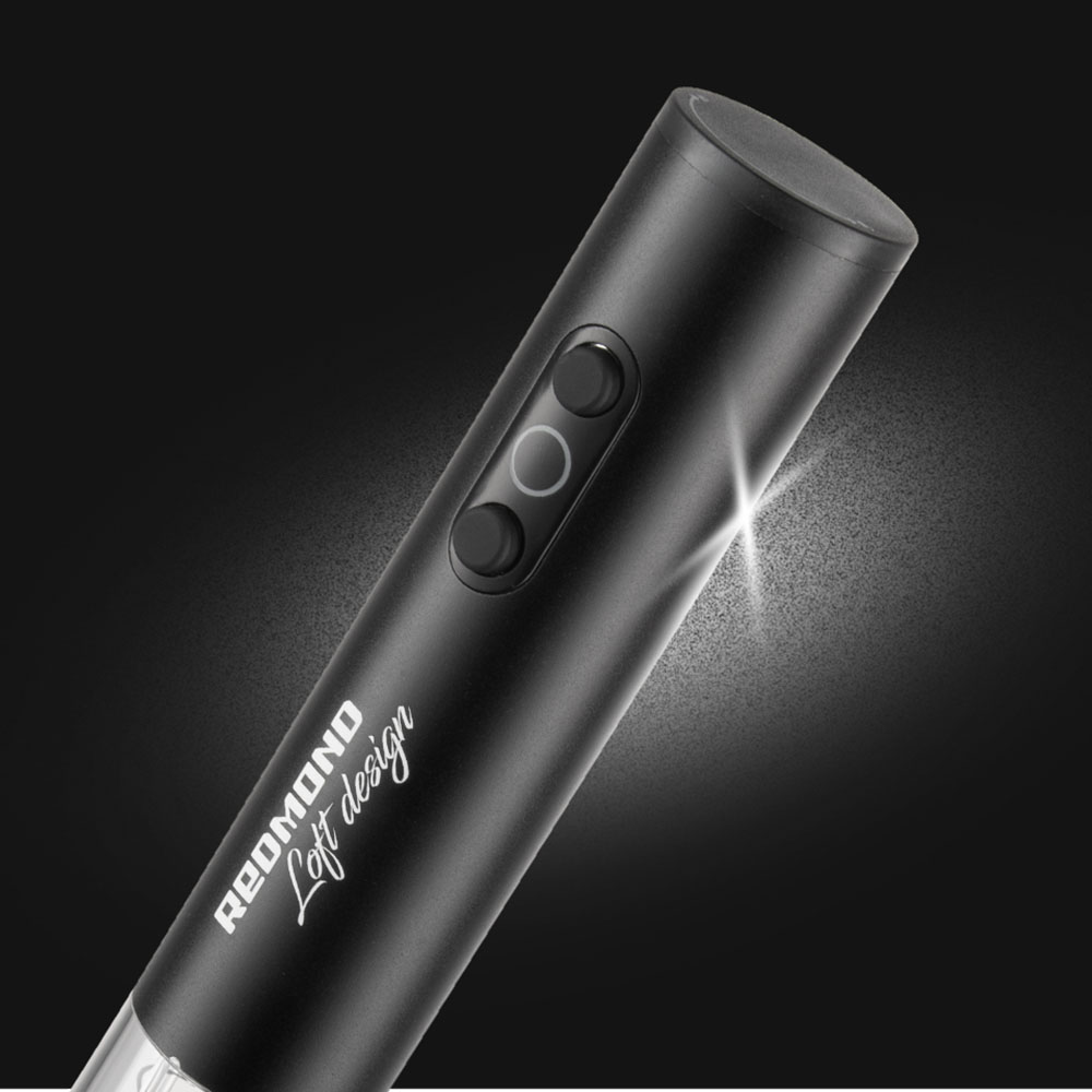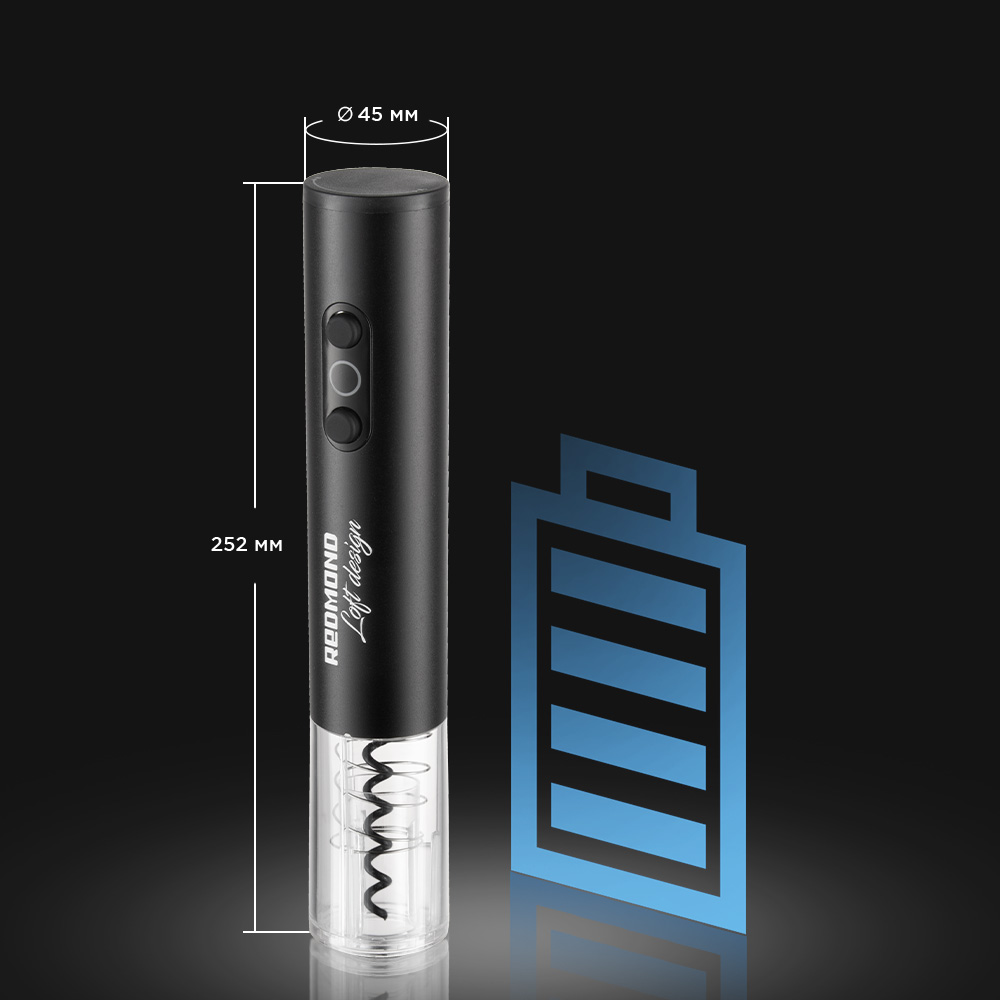 Штопор РЕДМОНД RKA-WO1 — электрическое устройство для аккуратного и быстрого извлечения пробок из винных бутылок. Металлический корпус повышает долговечность и устойчивость к механическим воздействиям. Встроенная подсветка облегчает контроль процесса извлечения пробки, особенно при слабом освещении. В комплект входит нож для снятия фольги, что позволяет полностью подготовить бутылку к открытию одним прибором. Модель подходит для бутылок с горлышком до 35 мм и работает от 4 батареек типа AA. Одного комплекта батареек достаточно для открывания до 90 бутылок, что делает устройство удобным для регулярного использования.