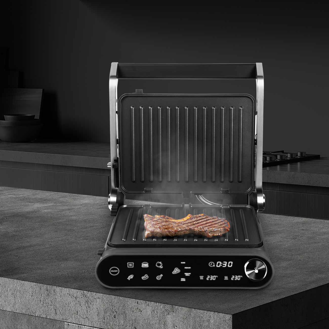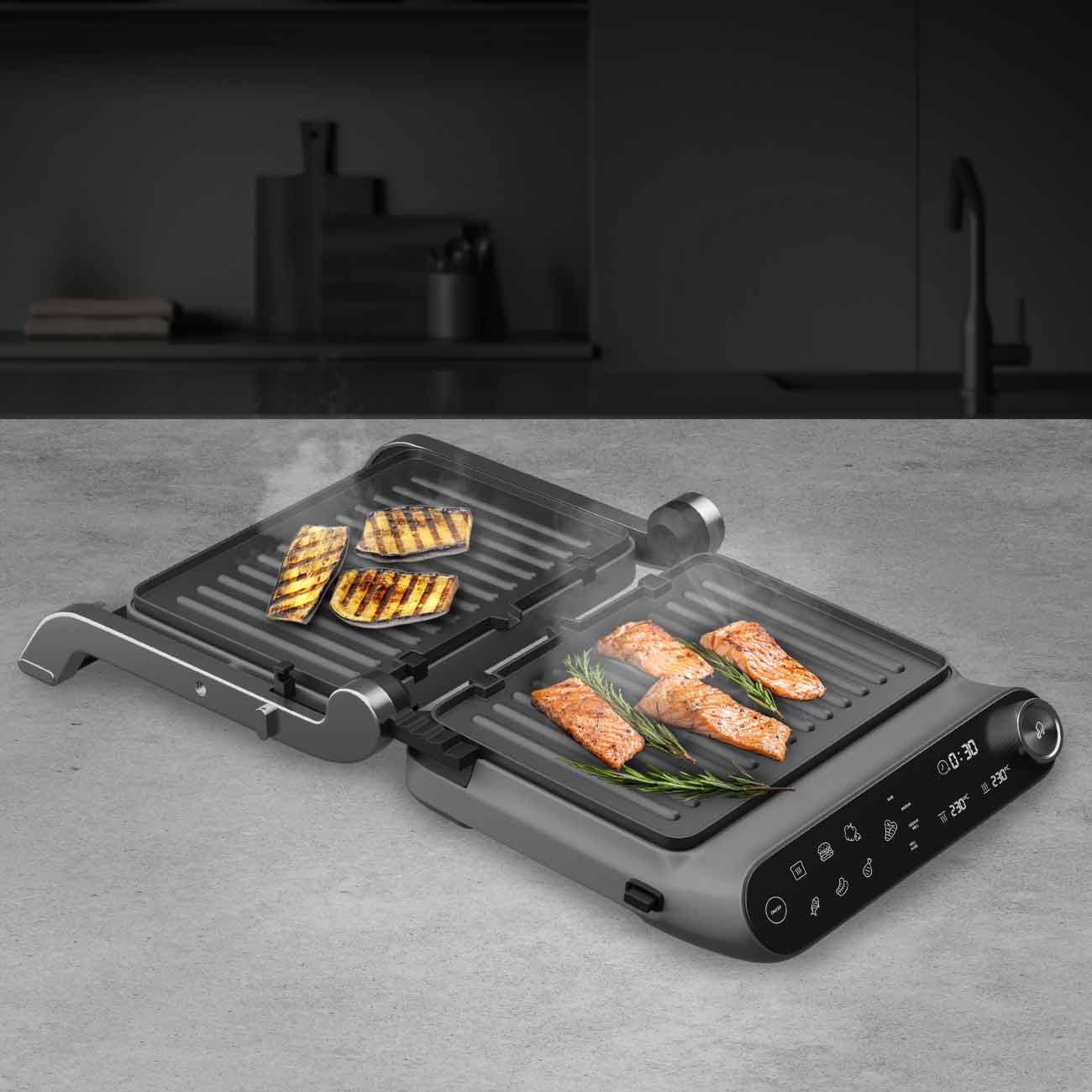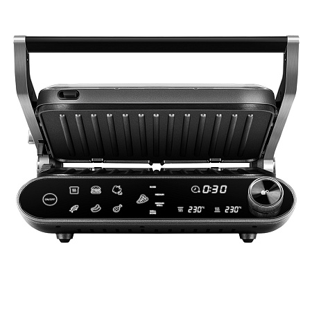 Панели устройства раскрываются на 180 градусов, что позволяет использовать прибор как барбекю. Готовьте на каждой стороне отдельное блюдо, чтобы удовлетворить запросы самых требовательных гостей.