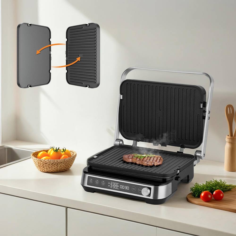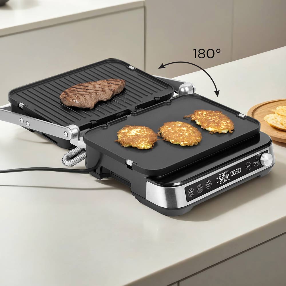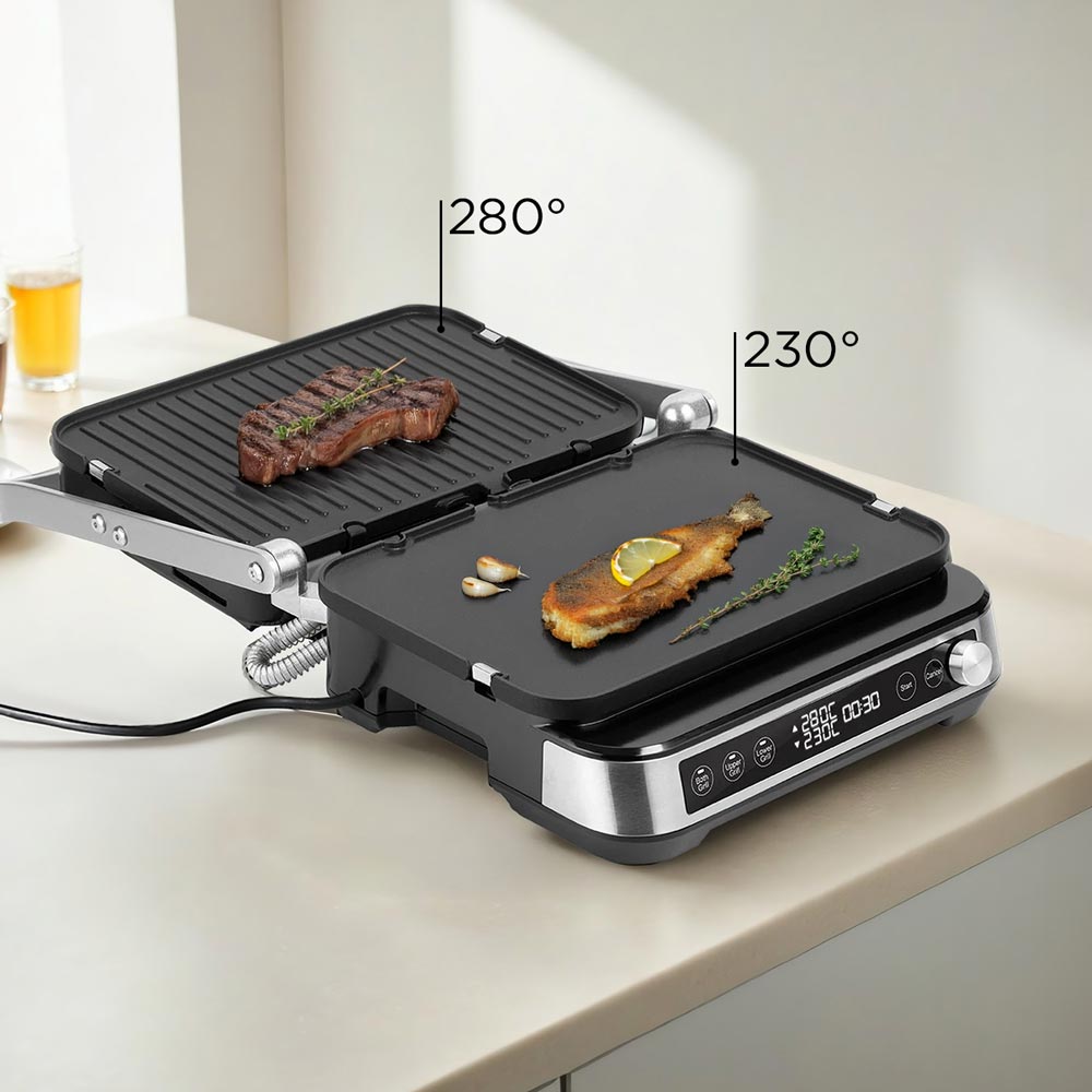 Обычно мясо готовится при высокой температуре, а овощи — при более низкой. Для этого в гриле предусмотрена функция электронного контроля температуры каждой панели. Она позволяет приготовить мясо и гарнир одновременно.