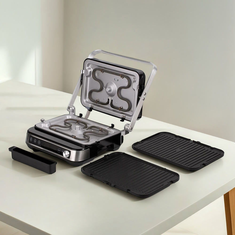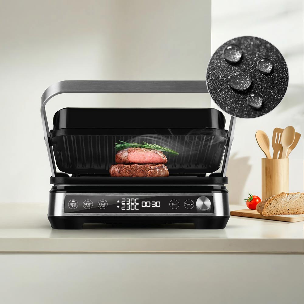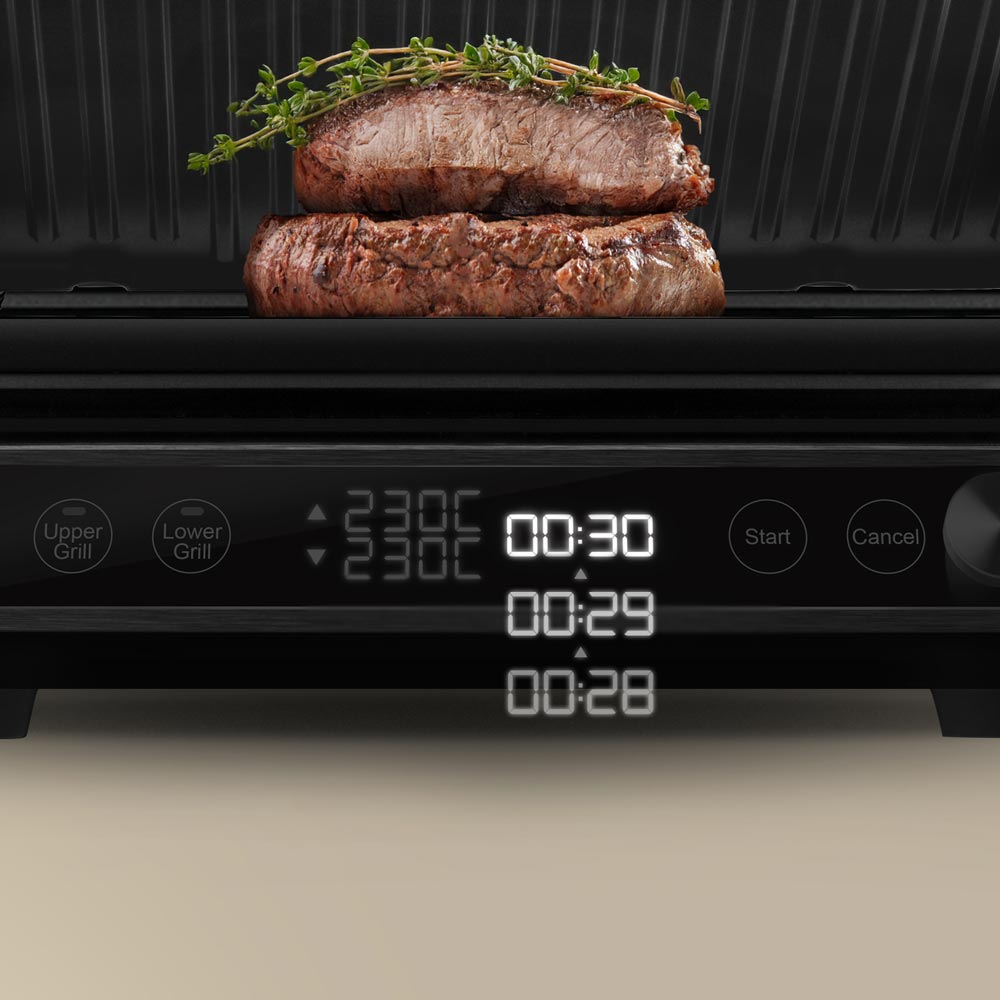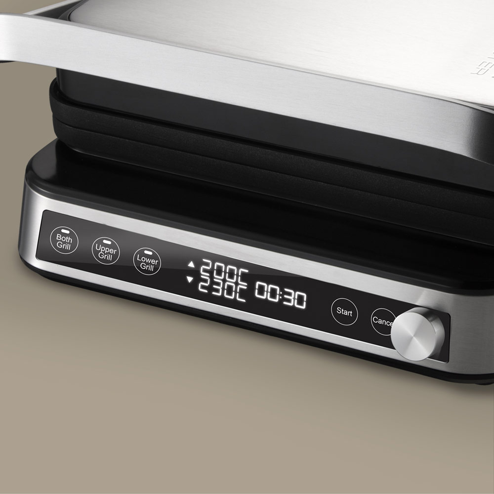Благодаря сенсорному дисплею вы можете настраивать гриль легкими касаниями и отслеживать процесс приготовления. Также он быстро очищается от пятен жира, отпечатков пальцев и других загрязнений.