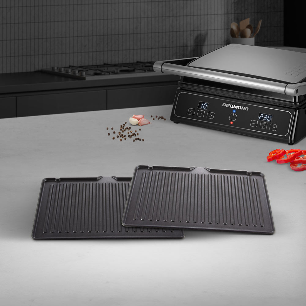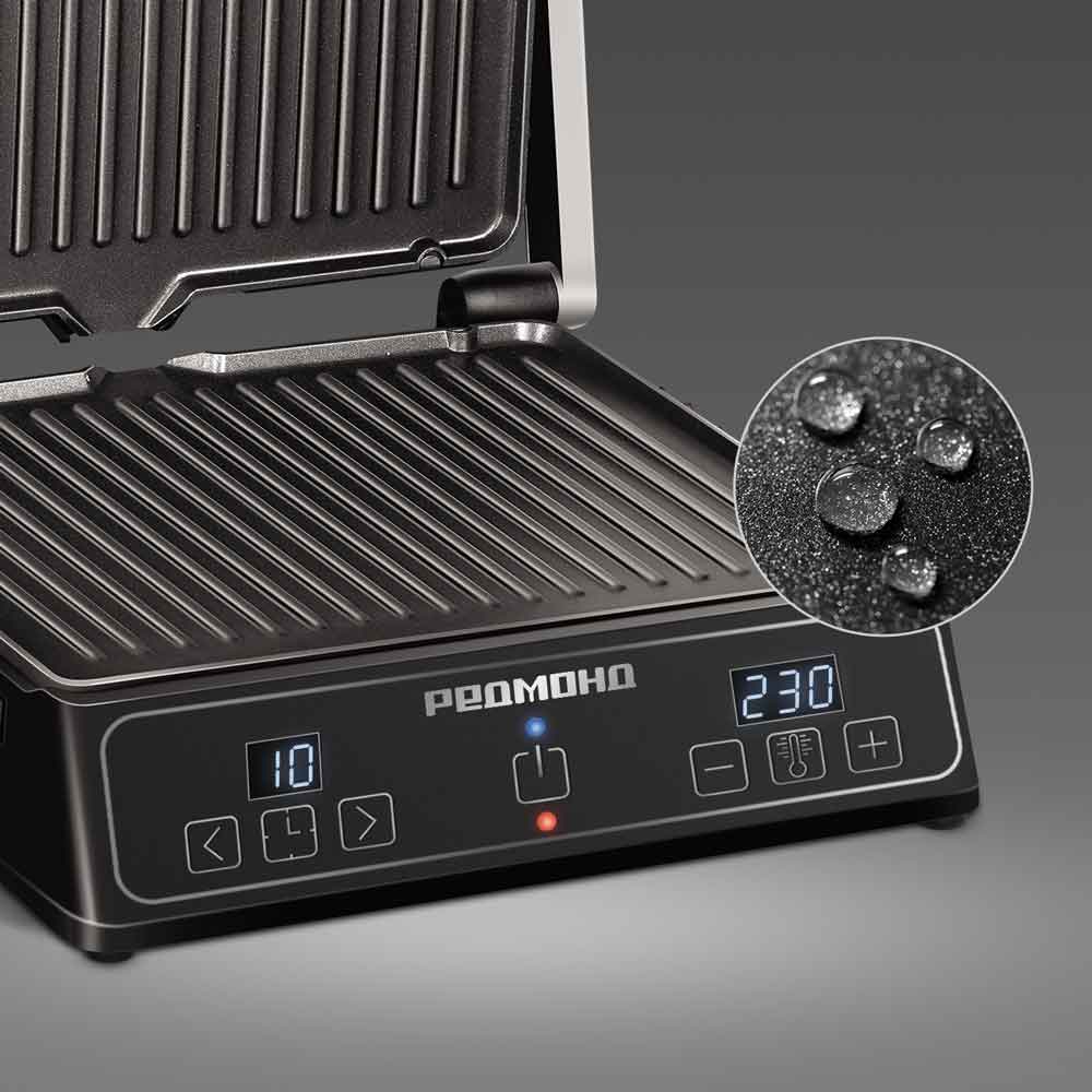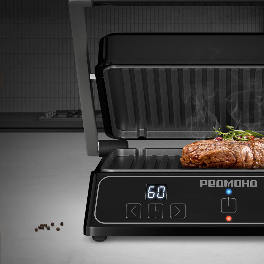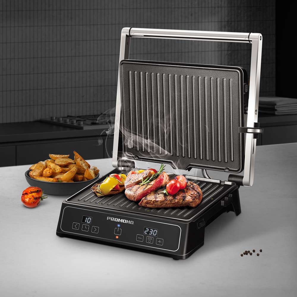 РЕДМОНД SteakMaster GM309 сочетает в себе функции гриля, барбекю и духовки. Панели с антипригарным покрытием съемные и легко очищаются. Быстрый равномерный нагрев и таймер помогут приготовить стейк безупречной прожарки и сочные овощи. У гриля электронное управление — вы с легкостью установите необходимые настройки.