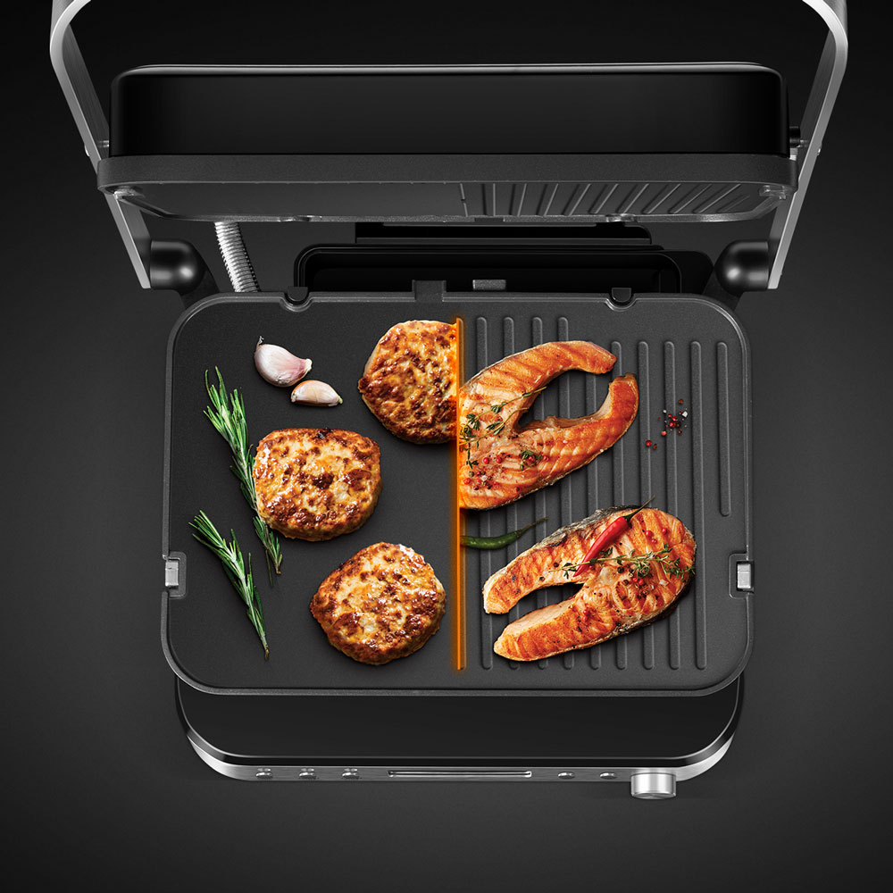 Мощный гриль SteakMaster RGM-M819D – это многофункциональное устройство, с помощью которого можно жарить, запекать и делать барбекю. Благодаря равномерному прогреву с двух сторон ваши любимые блюда в SteakMaster будут готовы быстрее, чем на обычной плите или в духовке.