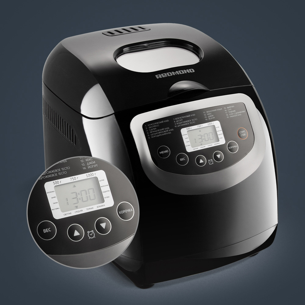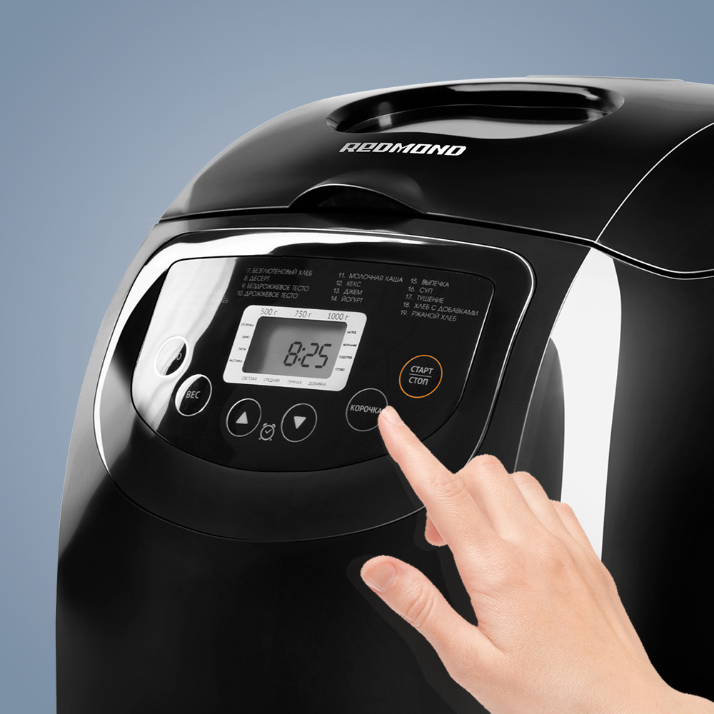 В универсальной хлебопечи РЕДМОНД RBM-M1913 вы с легкостью испечете домашний хлеб, ароматную сладкую и сытную выпечку, а также сможете приготовить вторые блюда, йогурт или джем. 19 автоматических программ приготовления, которыми оснащена хлебопечь, позволят вам тратить на приготовление минимум времени. Вам не придется замешивать и растаивать тесто, регулировать нагрев или степень поджаристости хлебной корочки: все, что потребуется от вас, – выложить ингредиенты в чашу, выбрать программу и нажать «Старт».