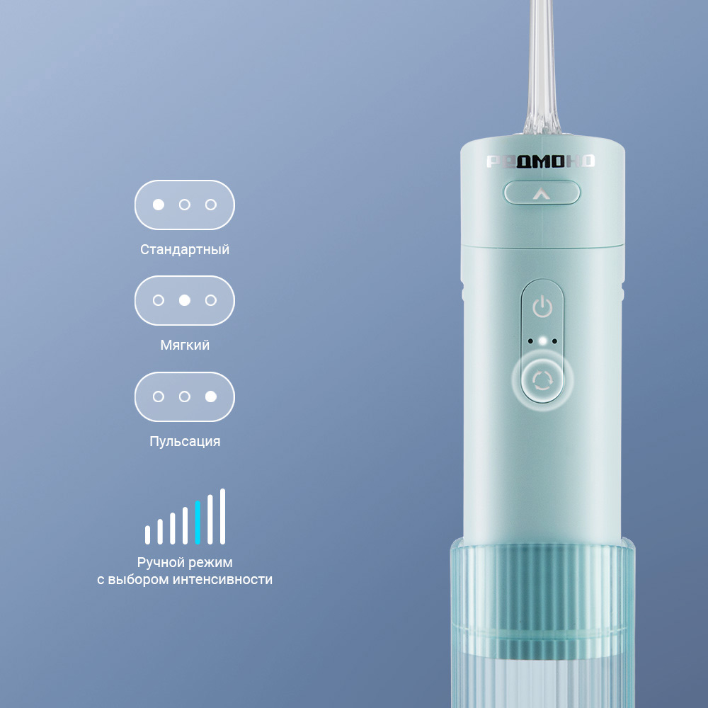 РЕДМОНД YR4504 — портативный ирригатор для полноценного ухода за полостью рта в домашних условиях и в поездках. Он оснащен 4 режимами работы, включая ручной с возможностью точной настройки давления струи, что позволяет адаптировать чистку под индивидуальные особенности. Подходит для ежедневного использования, в том числе при чувствительности десен или наличии брекетов. Благодаря складному корпусу и отдельному отсеку для насадки YR4504 удобно хранить и брать с собой.