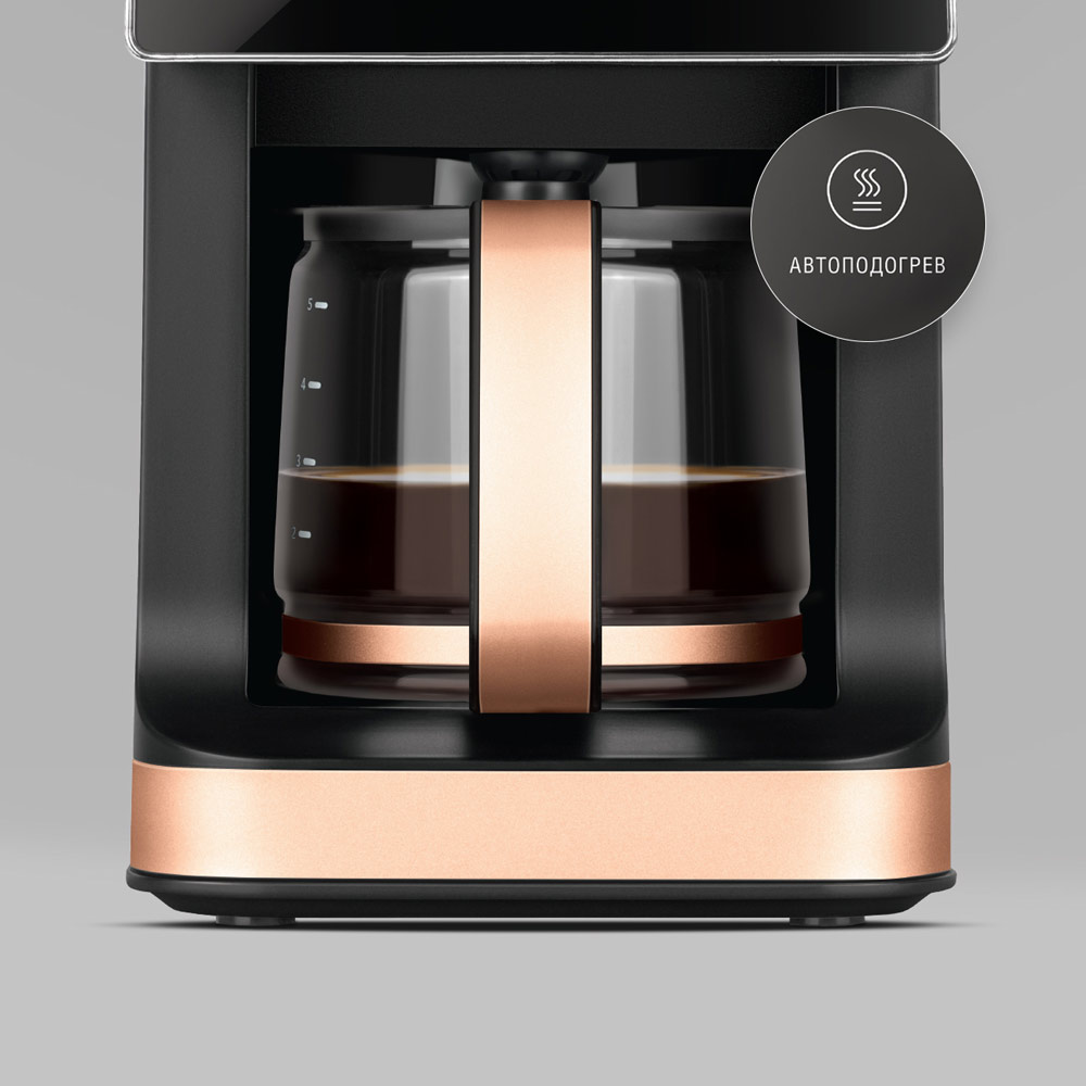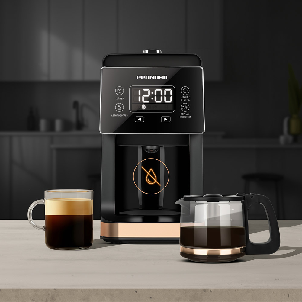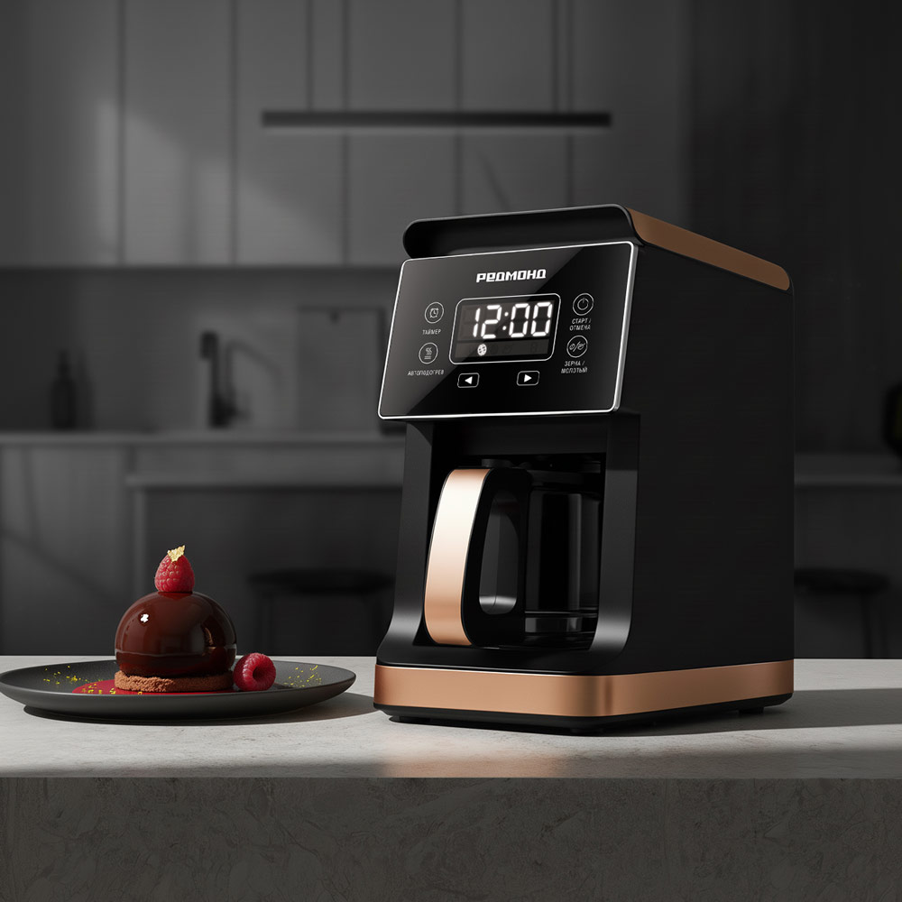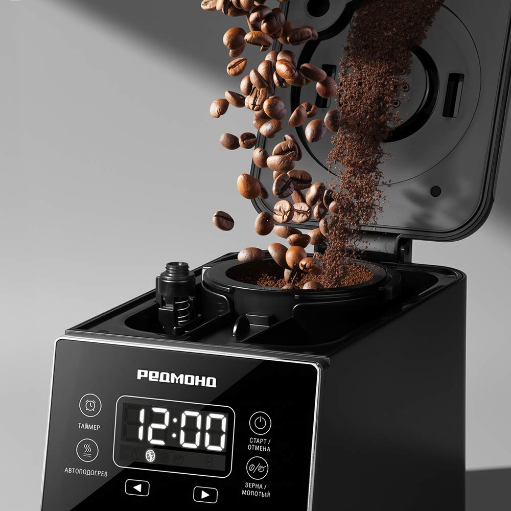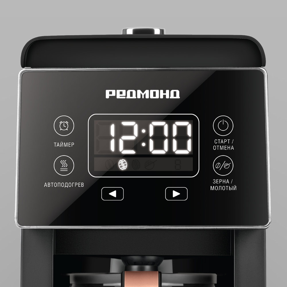Кофеварка РЕДМОНД CM720 капельного типа в утонченном дизайне может сварить кофе как из молотого, так и из зернового кофе, поскольку оснащена кофемолкой. Управлять устройством удобно благодаря сенсорной панели управления. Если у вас мало времени на приготовление, поможет функция отложенного старта. Автоподогрев до 3 часов гарантирует, что готовый напиток не остынет быстро.