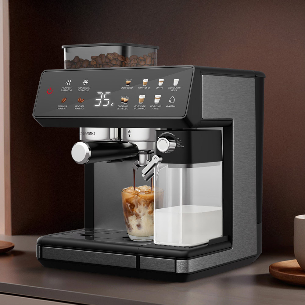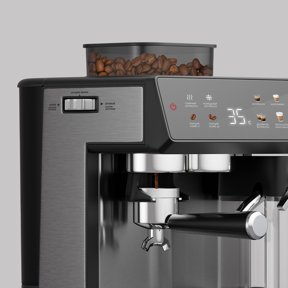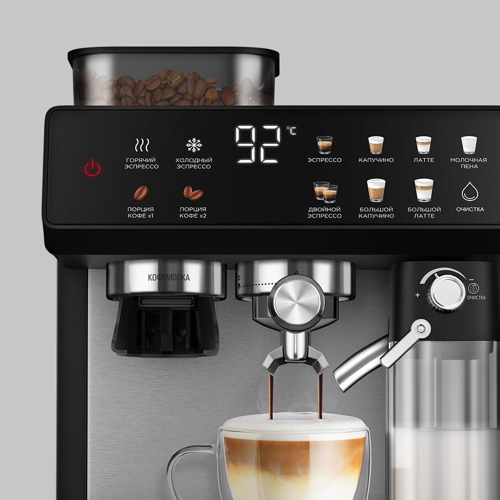 Кофейная станция РЕДМОНД CM738 позволяет готовить четыре вида кофе, включая варианты с молочной пеной разной плотности: эспрессо, капучино, латте и айс-кофе. Встроенная кофемолка с уникальной конструкцией и 20 степенями помола обеспечивает оптимальный помол для любого способа приготовления. Итальянская помпа ULKA гарантирует стабильное качество, а функция предсмачивания — безупречный вкус кофе.