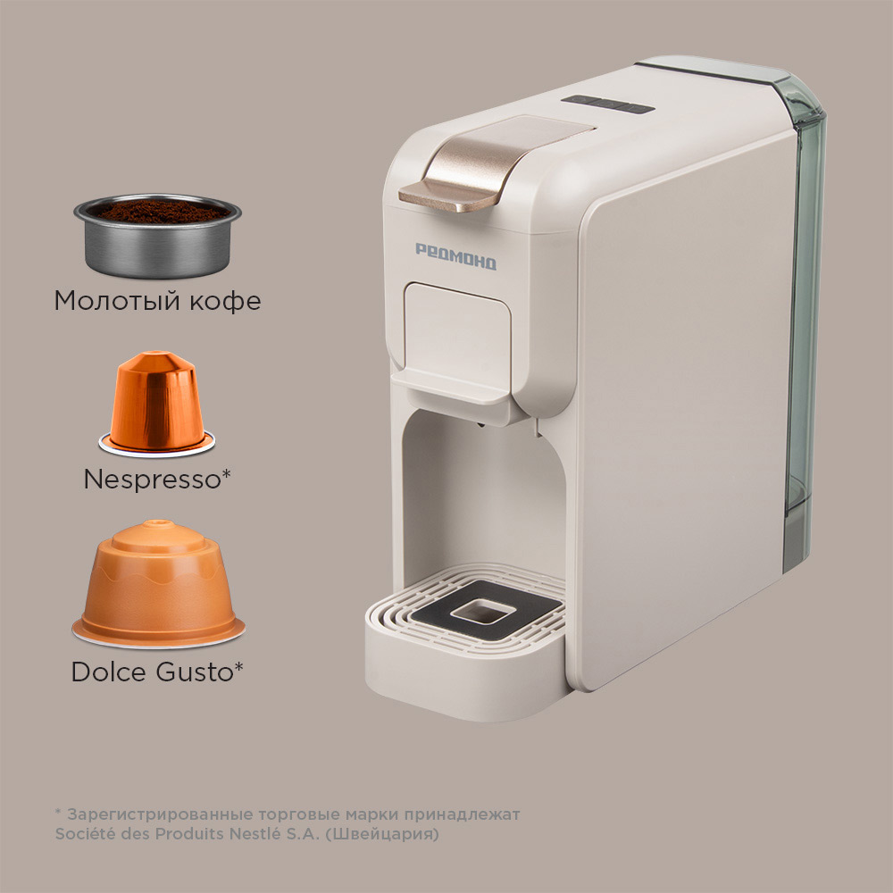Капсульная кофеварка РЕДМОНД СМ713 готовит эспрессо из молотого кофе и любые другие напитки на ваш вкус с использованием капсул Nespresso* и Dolce Gusto*. Двухуровневая система давления 15 бар сделает идеальную крема на кофе. За счет компактного корпуса устройство органично будет смотреться на любой кухне. Кофеварка запомнит объем напитка, который вы предпочитаете: достаточно один раз выбрать необходимые параметры.