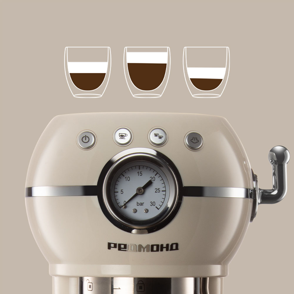 Кофеварка РЕДМОНД CM722 с элегантным дизайном в стиле ретро станет украшением вашей кухни. Округлый корпус в бежевом цвете придает устройству особый шарм. На передней панели расположен манометр, который позволит контролировать давление при приготовлении кофе для лучшего результата.