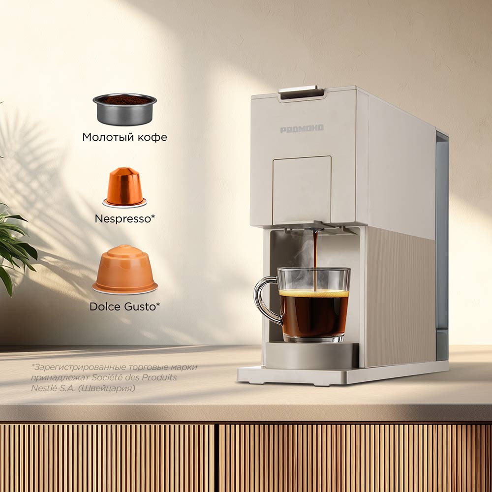 Капсульная кофеварка РЕДМОНД CM723 выполнена в стильном компактном корпусе и оснащена адаптерами для молотого кофе и капсул Dolce Gusto*, Nespresso*. Она достигает рабочей температуры всего за 30 секунд, а двухуровневая система давления обеспечивает образование идеальной пенки. Объем порции можно отрегулировать и сохранить настройки. Кофеварка не займет много места, но позволит приготовить ароматные напитки себе и близким благодаря резервуару на 900 мл.