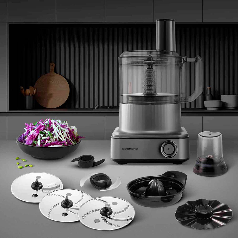 РЕДМОНД FP608 — многофункциональный кухонный комбайн 8 в 1 с объемной чашей на 2300 мл и мощным двигателем. Комплект из 8 насадок для подготовки ингредиентов позволит готовить в больших количествах и с меньшими усилиями. Подойдет большой семье или просто тем, кто делает много салатов, закусок, заготовок на зиму. Комбайн легко измельчает твердые продукты: орехи, кофейные зерна, твердый сыр. Подходит для замешивания жидкого теста и приготовления соусов.