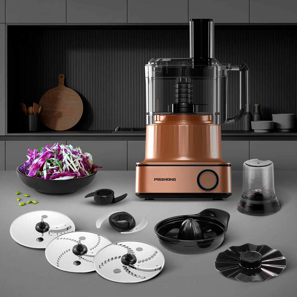 РЕДМОНД FP608 — многофункциональный кухонный комбайн 8 в 1 с объемной чашей на 2300 мл и мощным двигателем. Комплект из 8 насадок для подготовки ингредиентов позволит готовить в больших количествах и с меньшими усилиями. Подойдет большой семье или просто тем, кто делает много салатов, закусок, заготовок на зиму. Комбайн легко измельчает твердые продукты: орехи, кофейные зерна, твердый сыр. Подходит для замешивания жидкого теста и приготовления соусов.
