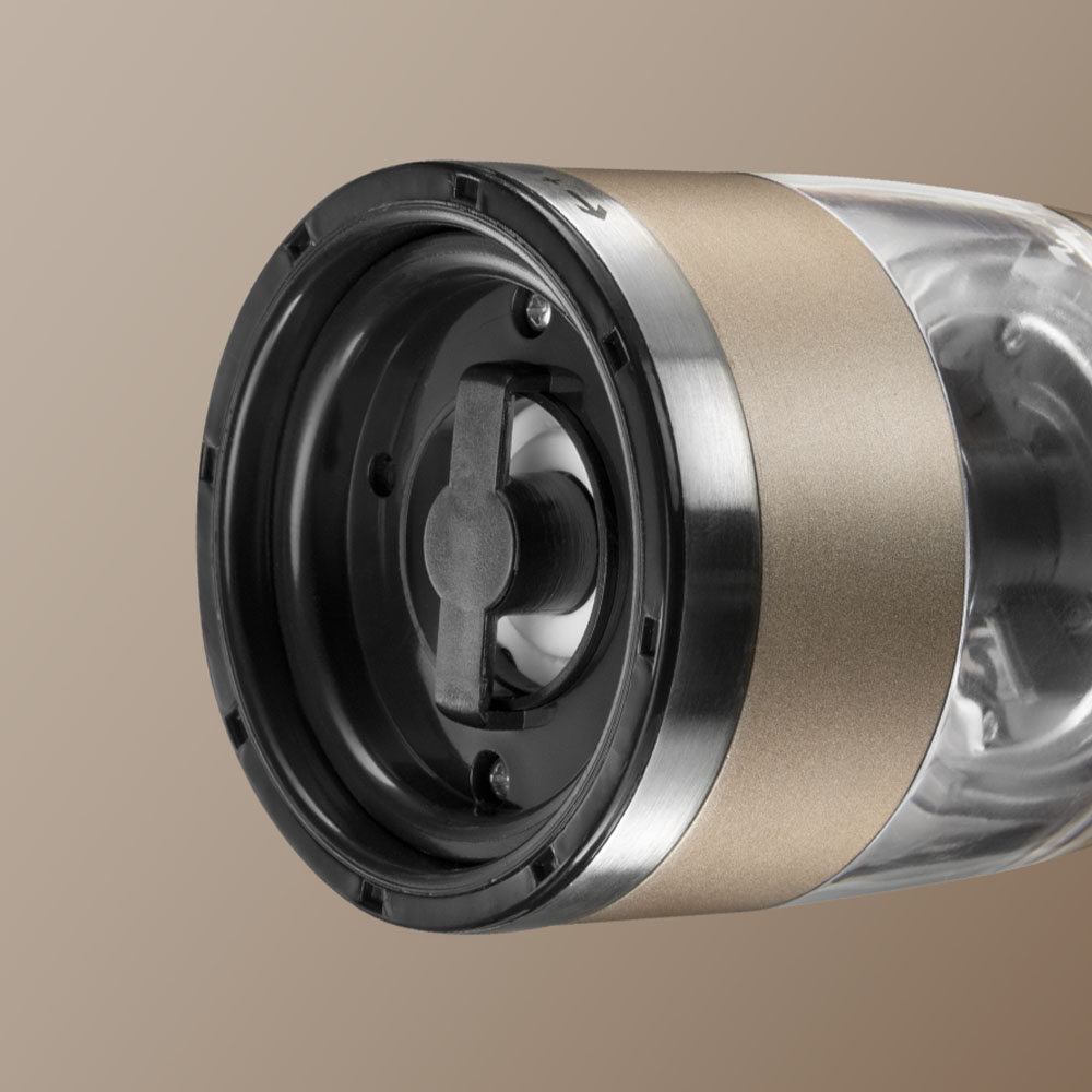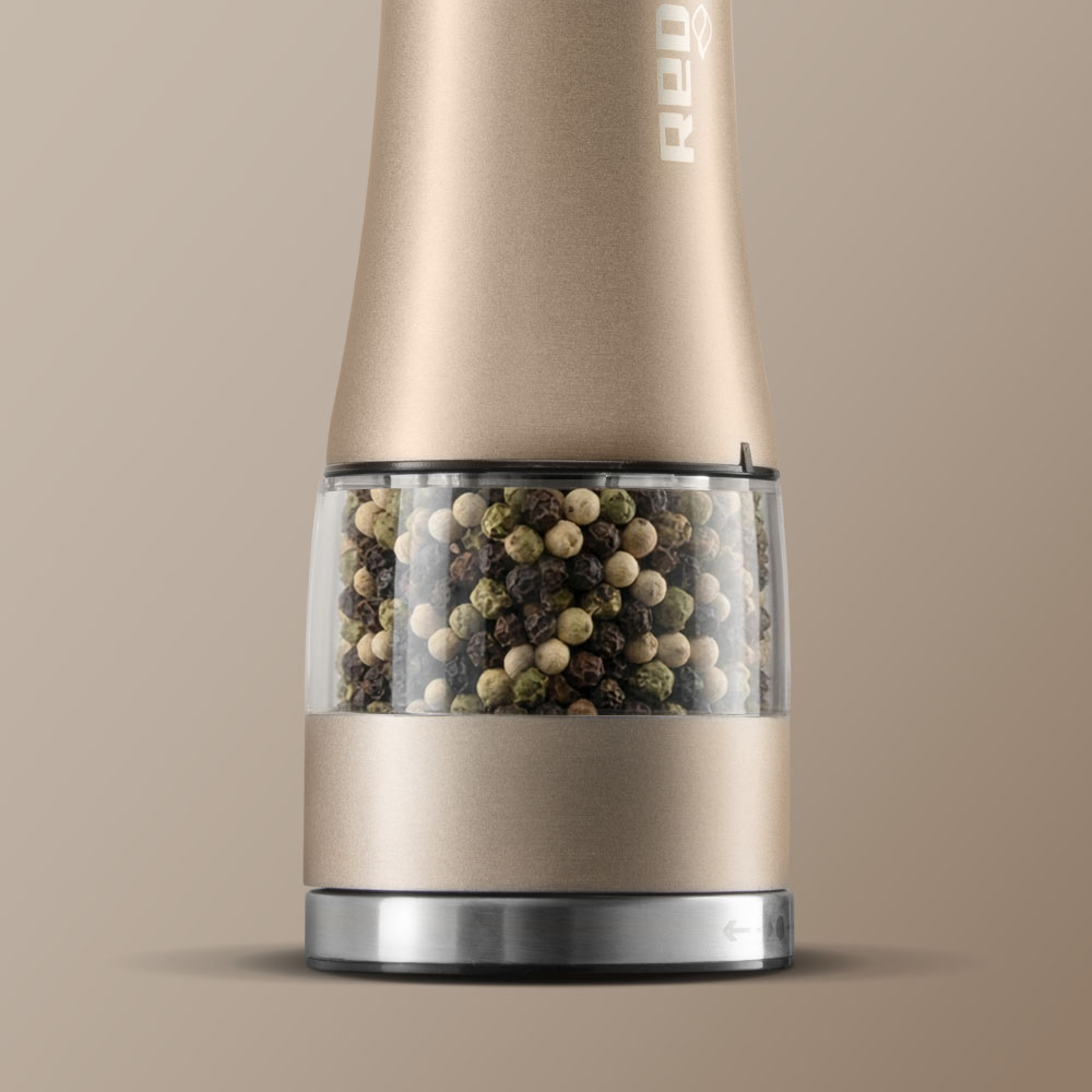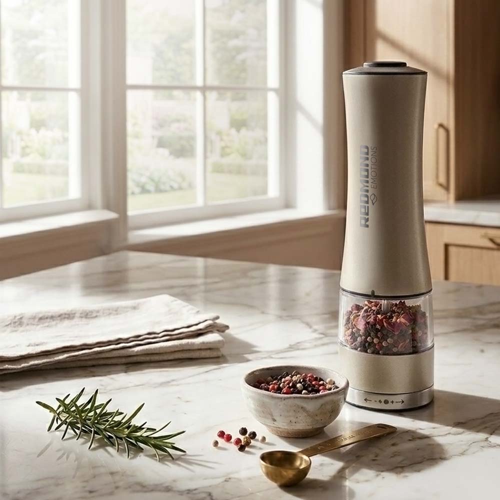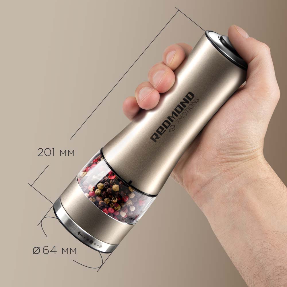 Мельница для специй REDMOND RKA-PM7 оснащена прочным металлическим корпусом, устойчивым к повреждениям и коррозии. Надежные керамические жернова обеспечивают долговечность устройства и равномерную помолку специй без изменения их естественного вкуса. Конструкция предусматривает регулировку степени помола и удобную подсветку для точного дозирования. Объем контейнера составляет 55 мл, питание осуществляется от четырех батареек типа AA — рекомендуется использовать новые качественные элементы питания для стабильной работы.
