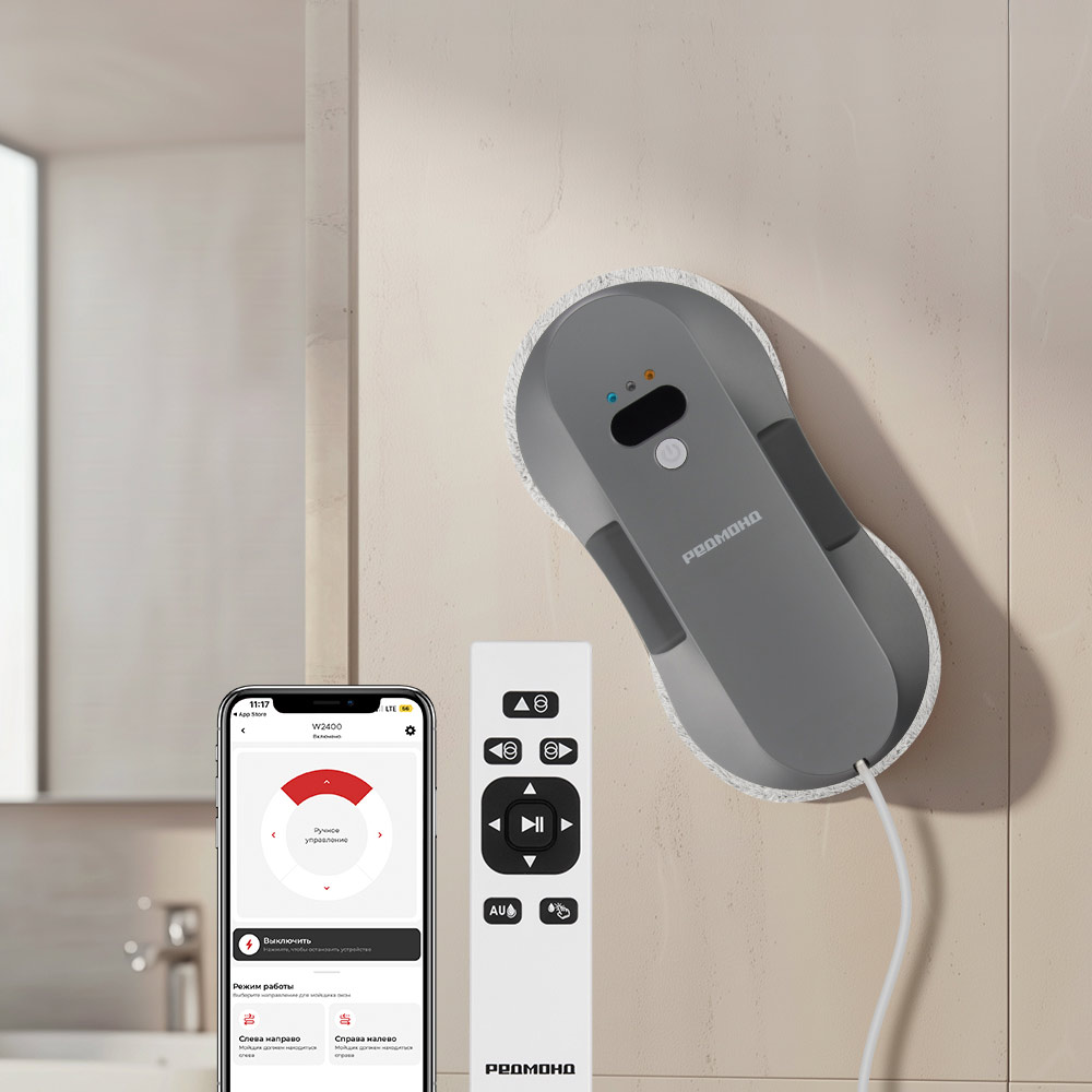 РЕДМОНД W2400S — умный робот-мойщик нового поколения, созданный для автоматической и деликатной очистки стеклянных и кафельных поверхностей. Устройство оснащено системой AutoSpray с двойным распылением, которая обеспечивает оптимальное увлажнение и безупречное качество уборки без разводов. Алгоритмы навигации автоматически определяют границы поверхности, позволяя роботу тщательно обработать участок любой сложности — от широких панорамных стекол до зеркал и душевых перегородок. Тонкий корпус всего 7 см делает модель универсальной для разных типов конструкций. Встроенный резервный аккумулятор и страховочный трос отвечают за безопасность работы на высоте, а управление через приложение REDMOND Home раскрывает полный функционал устройства. W2400S объединяет мощность, автономность и точность — это профессиональный уровень чистоты в компактном формате.