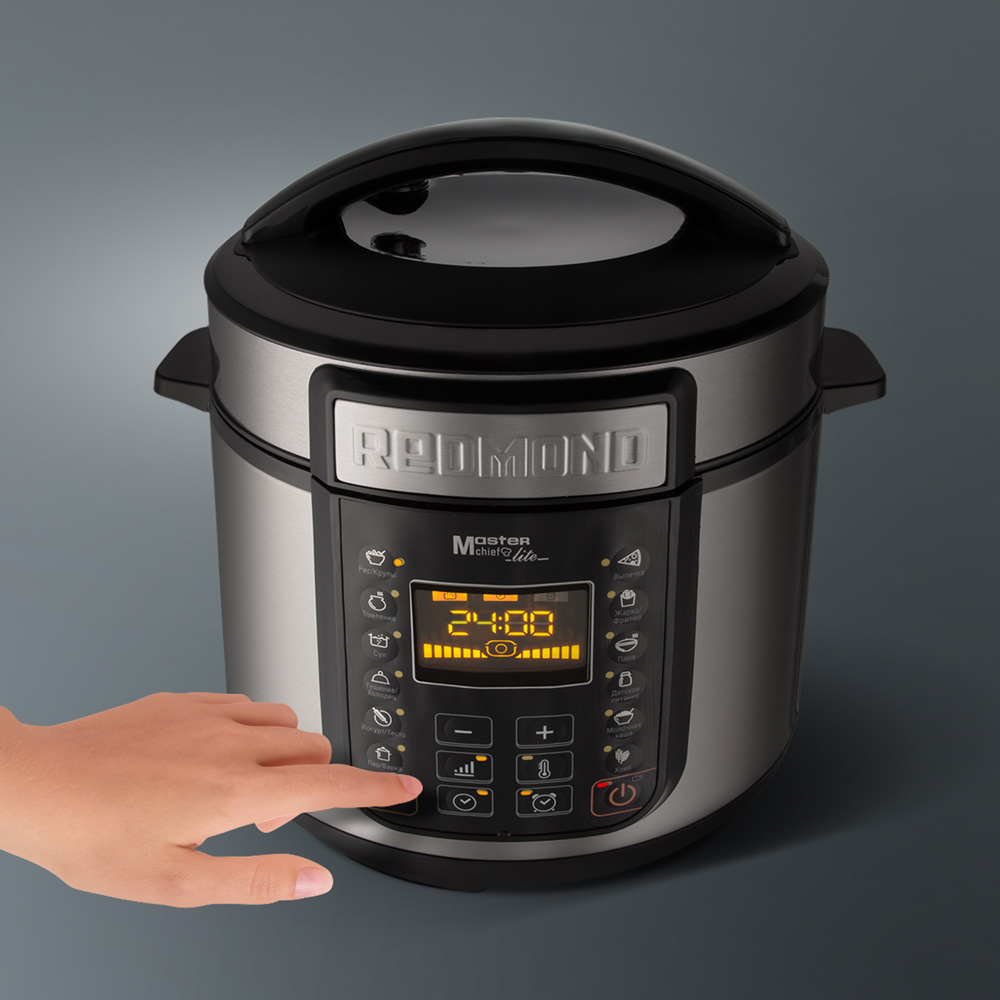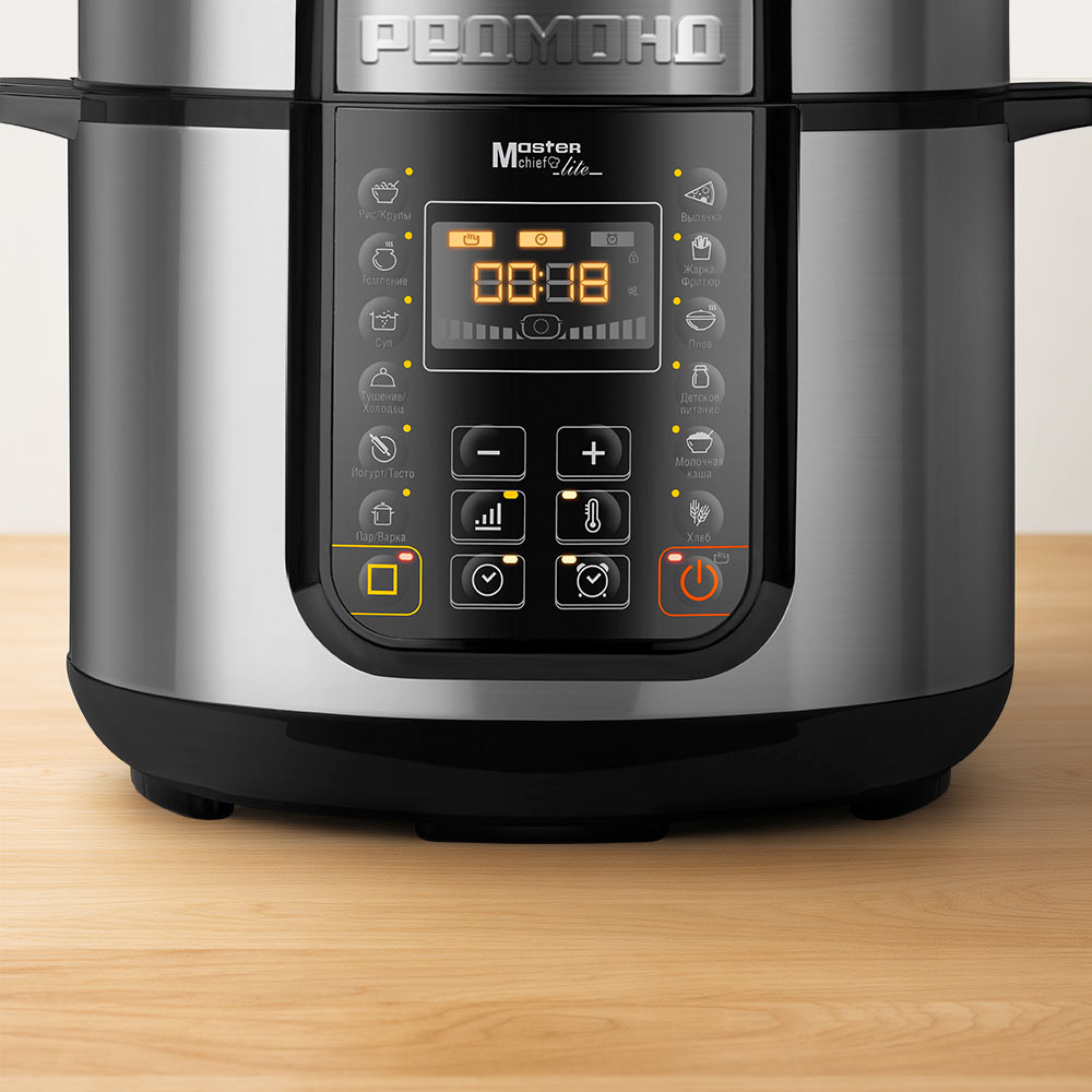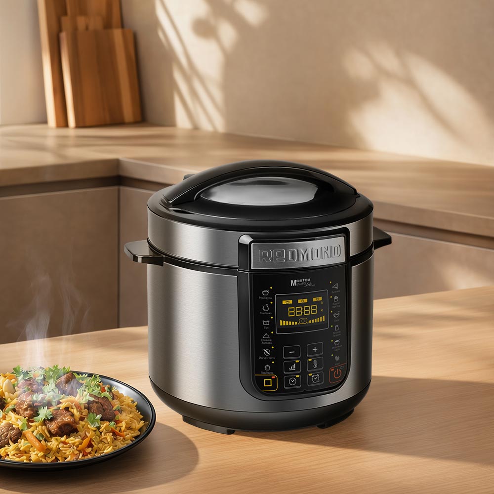РЕДМОНД RMC PM381 — мультиварка скороварка для приготовления еды на каждый день. Система безопасности из 4 уровней контроля давления, функция МАСТЕРШЕФ ЛАЙТ для изменения настроек в процессе и автоматический подогрев делают процесс приготовления гибким и безопасным. RMC PM381 работает как скороварка, мультиварка и медленноварка, сохраняя максимум полезных веществ и насыщенный вкус продуктов.