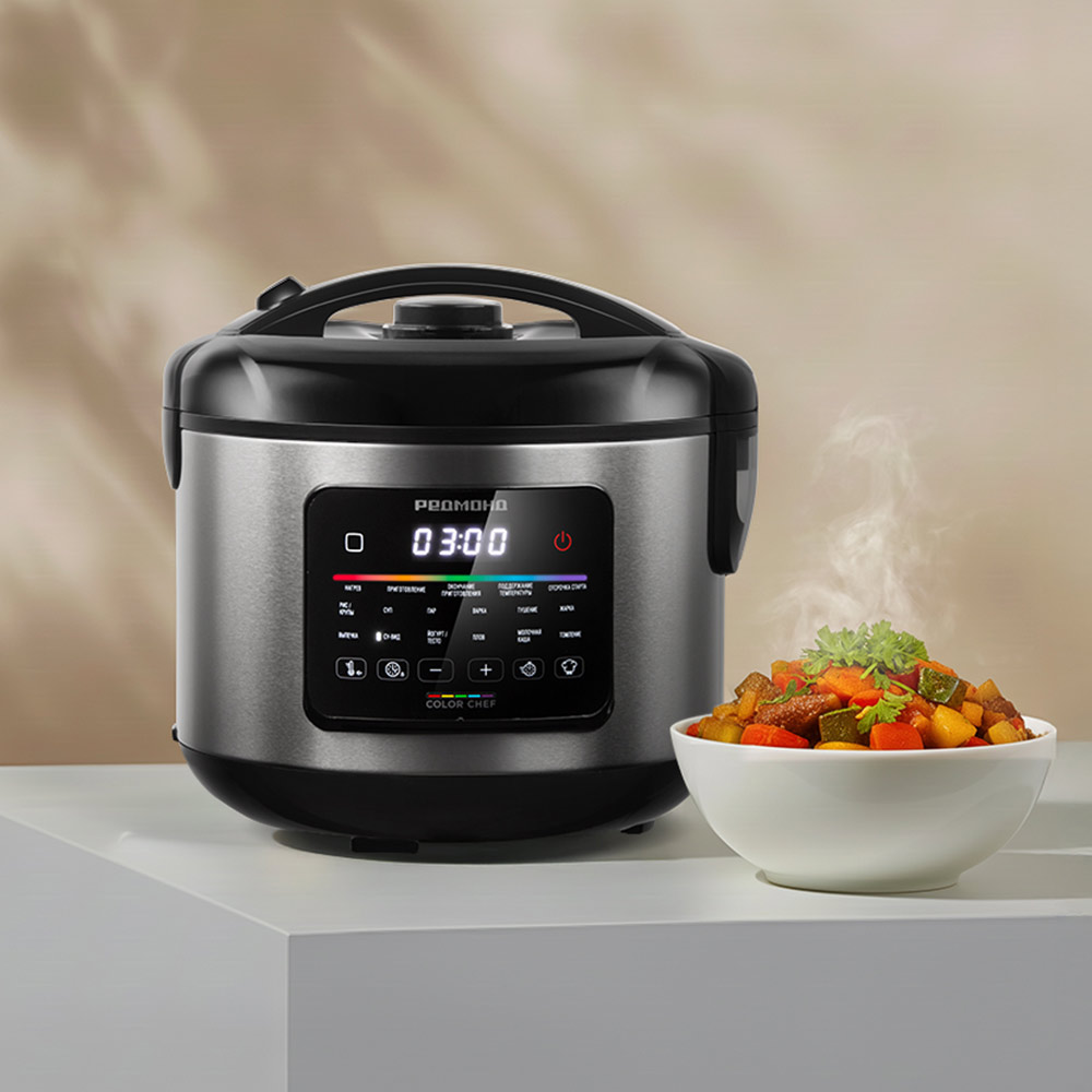 Мультиварка РЕДМОНД MC128 с 14 автоматическими программами будет незаменима на вашей кухне и подойдет для приготовления ужинов, выпечки, супов и каш. Управлять прибором легко благодаря сенсорной панели, а цветовая индикация Color Chef подскажет, на каком этапе находится приготовление. Компактная чаша объемом 3 литра рассчитана на одного человека или небольшую семью. За ней просто ухаживать: пища не прилипает к многослойному антипригарному покрытию DAIKIN®.