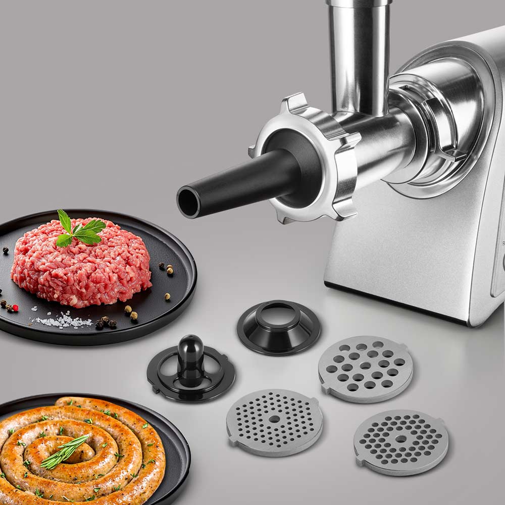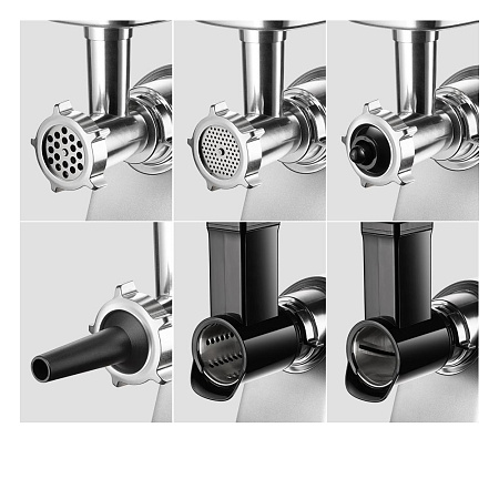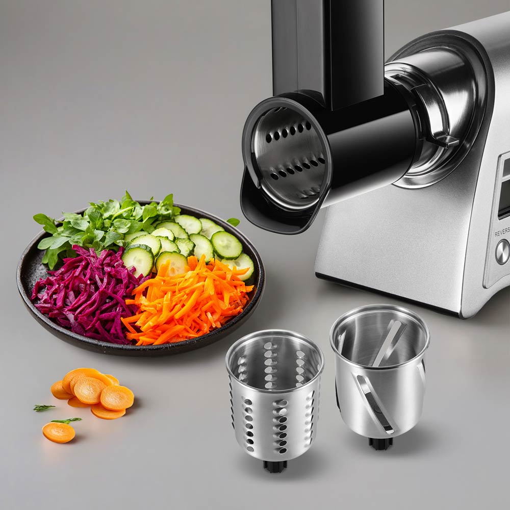 Мясорубка РЕДМОНД MG501 —многофункциональное устройство 2 в 1 — мясорубка и овощерезка — с увеличенной производительностью до 2,5 кг/мин. Благодаря комплекту насадок для овощей, мяса и колбасок прибор станет незаменимым помощником для хозяйки, желающей разнообразить ежедневный рацион вкусными и полезными блюдами. Мясорубка с литым корпусом из металла будет прочно стоять на столе, а в отсек для хранения аксессуаров можно убрать все насадки. Тройная защита двигателя гарантирует долгие годы комфортного пользования.