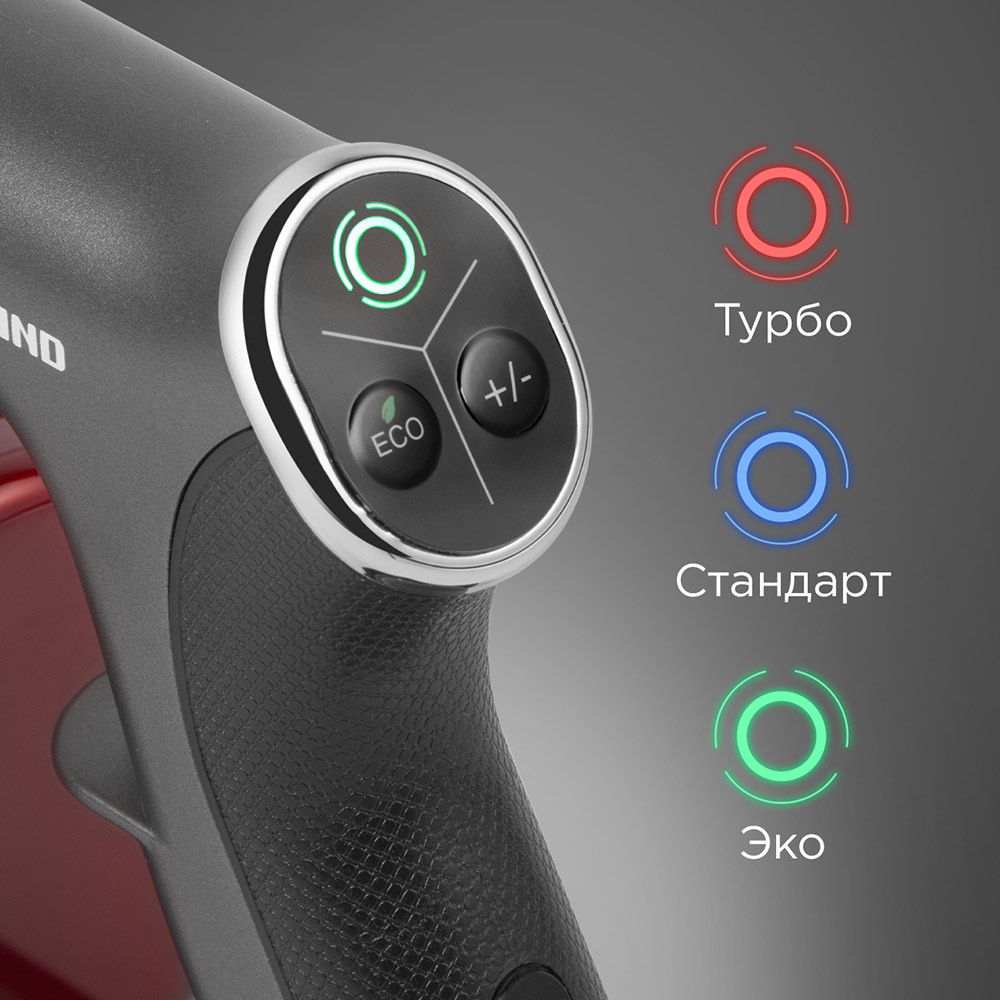 Ну и ещё мне понравилось, как он светится прикольно тремя разными цветами: синий при турборежиме, красный при обычном режиме и зелёный при экологичном режиме. Это интересная задумка, и я впервые встречаю нечто подобное. Чаще всего я пользуюсь именно экологичным, так как пол не сильно засоряется, хватает и такой уборки -