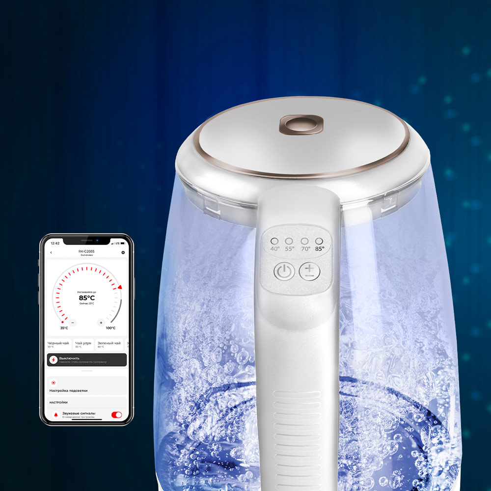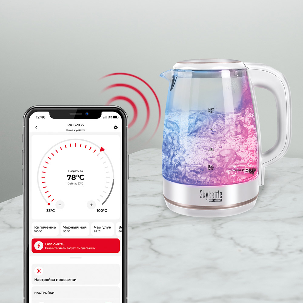 РЕДМОНД SkyKettle G203S – это умный чайник-светильник с дистанционным управлением. Установите на свой смартфон приложение Ready for Sky REDMOND, и вы сможете включать чайник и подогревать воду для приготовления любимого напитка, находясь в соседней комнате или даже на улице.