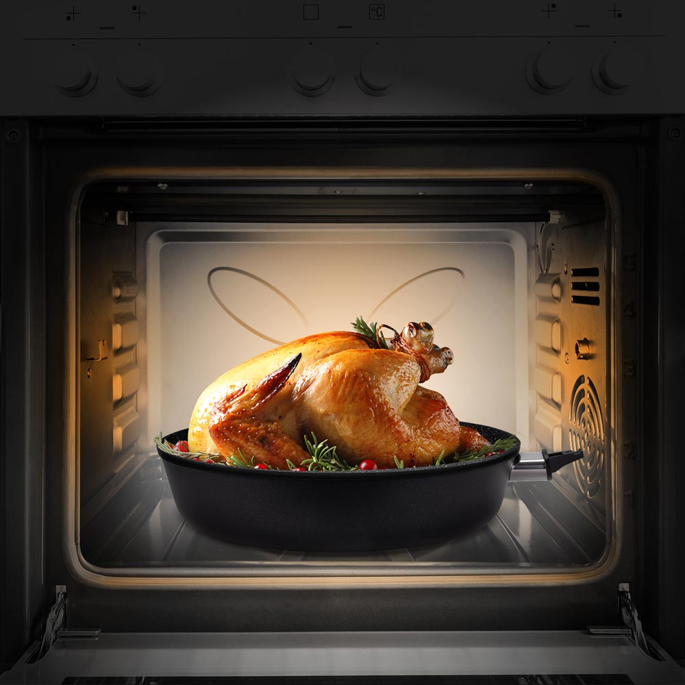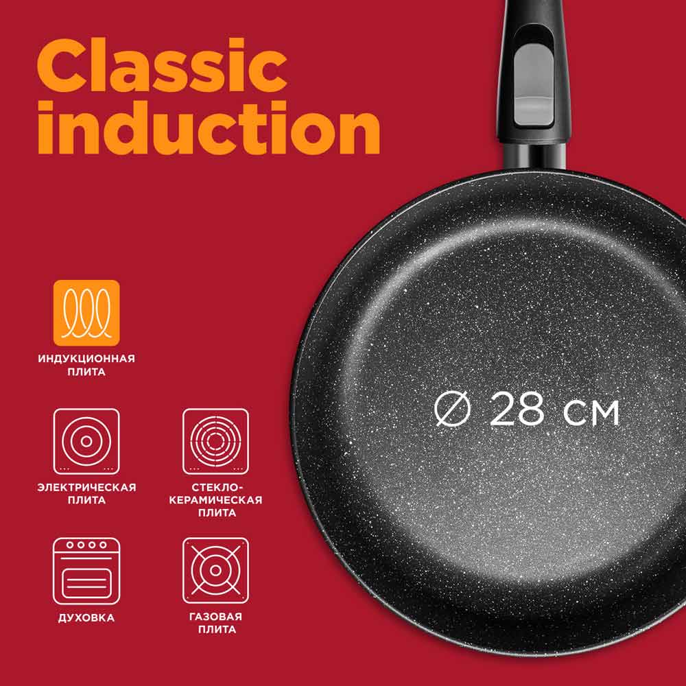 Классическая сковорода REDMOND PF5516 диаметром 28 см подойдет для приготовления любых блюд. На ней удобно жарить, тушить и запекать. Совместима с духовым шкафом и всеми видами плит, в том числе индукционной.