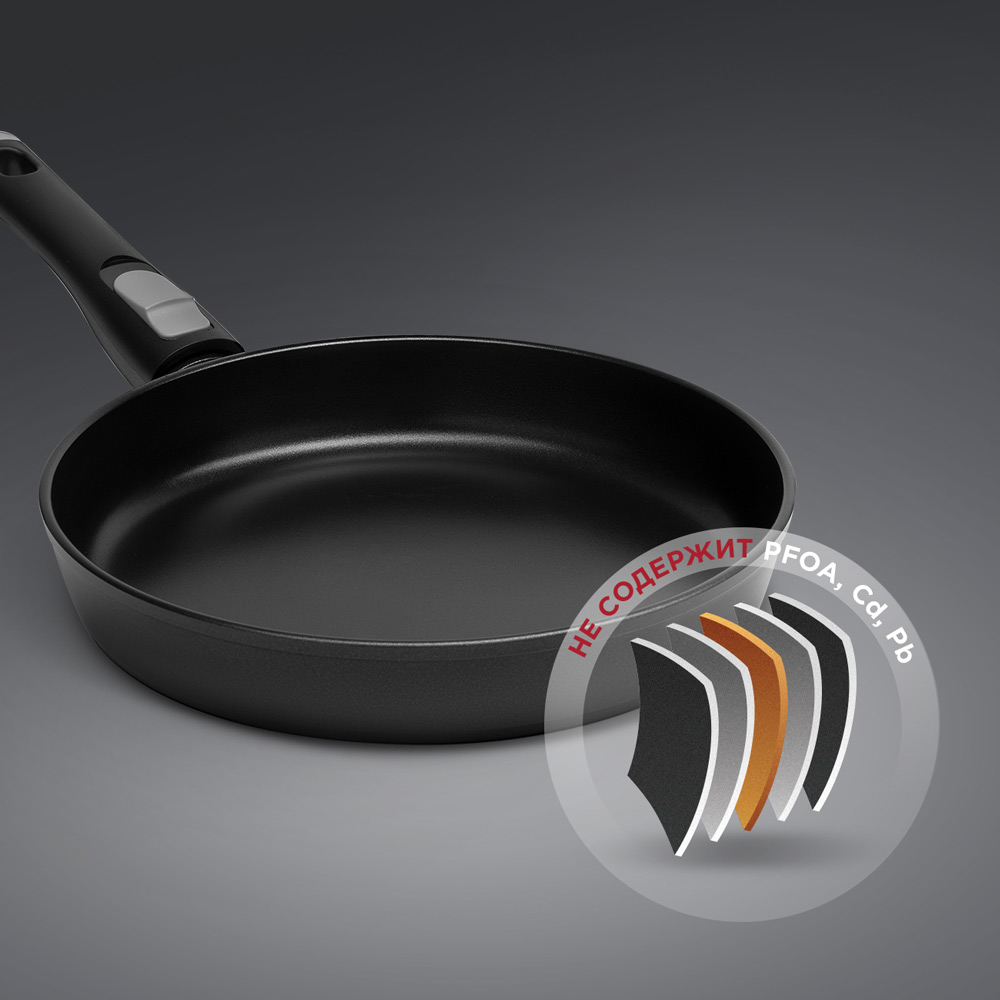 Низкая литая сковорода REDMOND PF5509 (26 см) — удобная и долговечная посуда для приготовления еды. Подходит для электрической, газовой и стеклокерамической плиты. Можно использовать в духовке, сняв ручку.