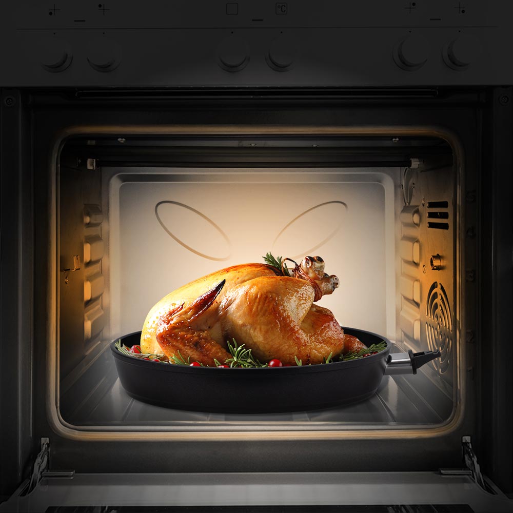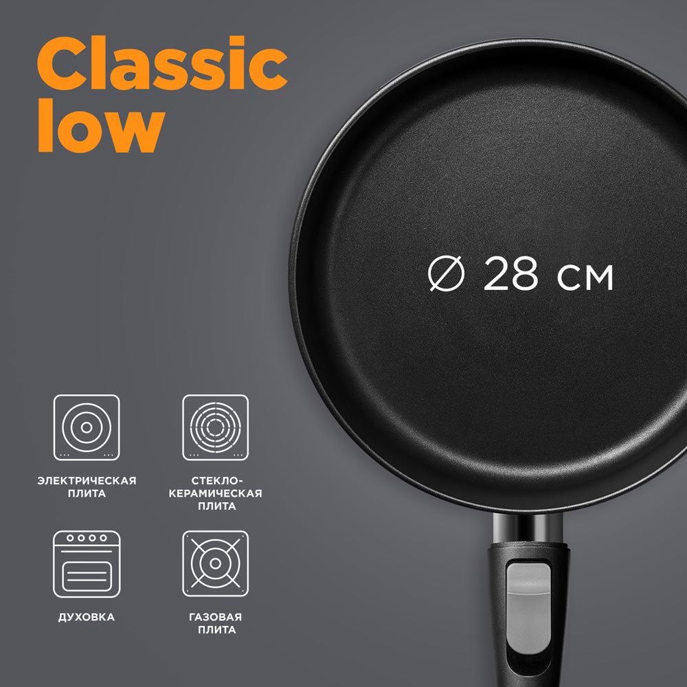 Низкая литая сковорода REDMOND PF5510 (28 см) — удобная и долговечная посуда для приготовления еды. Подходит для электрической, газовой и стеклокерамической плиты. Можно использовать в духовке, сняв ручку.