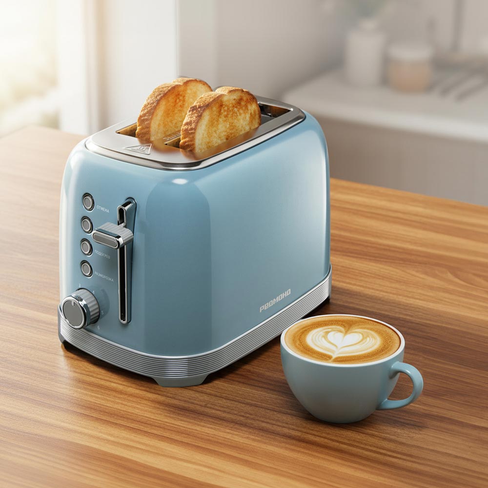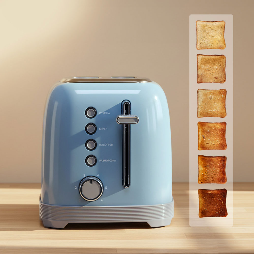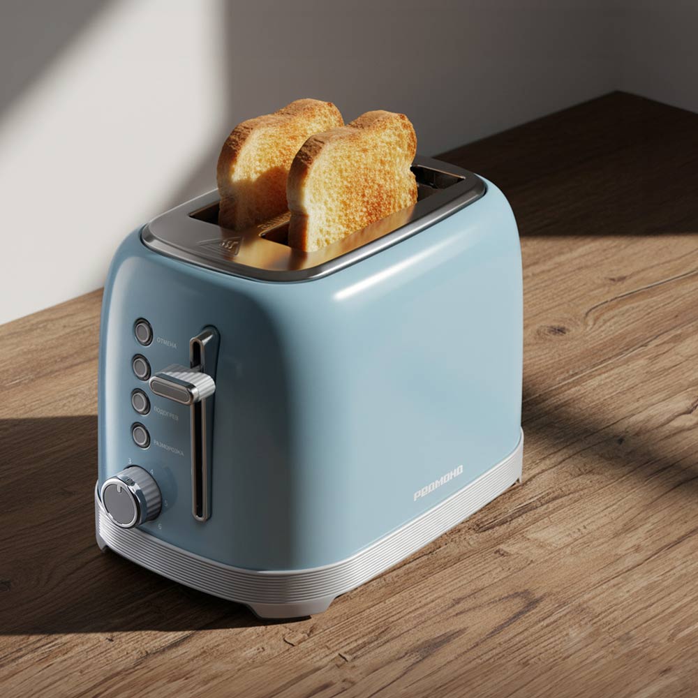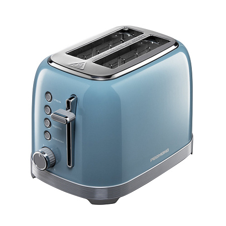 Тостер РЕДМОНД T910 в дизайне ретро и нежно-голубом цвете поможет приготовить тосты как со светлой, так и темной корочкой. Благодаря мощности 800 Вт он быстро поджарит, разморозит или подогреет ломтики хлеба, а на специальном режиме — придаст бейглу румяную корочку.
