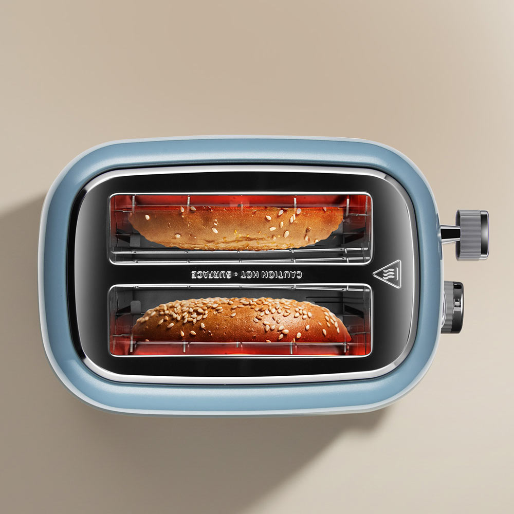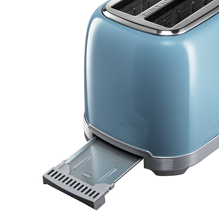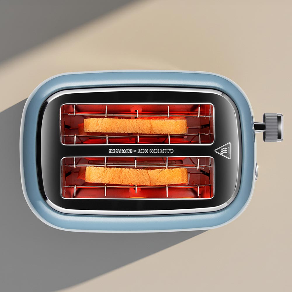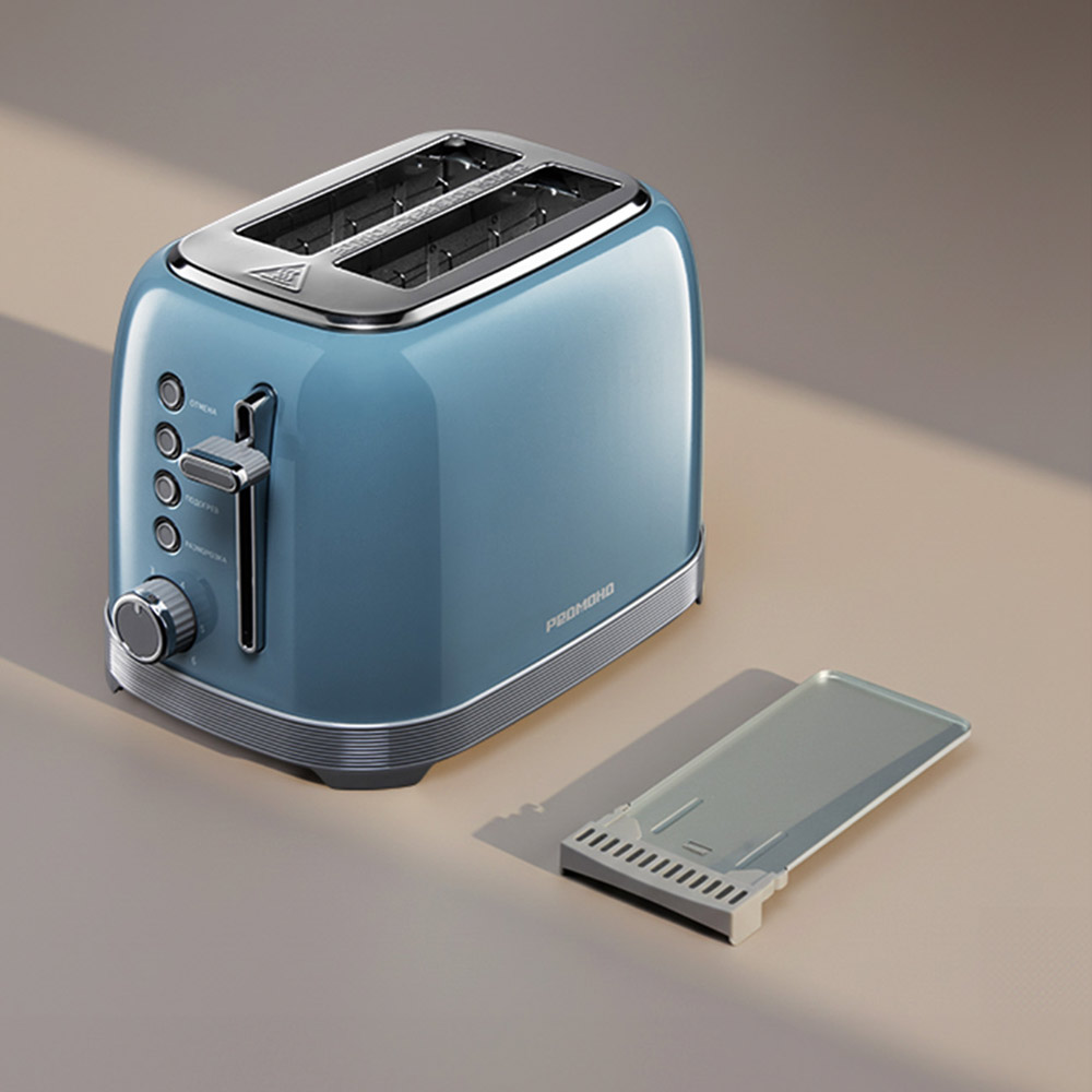 Тостер РЕДМОНД T910 в дизайне ретро и нежно-голубом цвете поможет приготовить тосты как со светлой, так и темной корочкой. Благодаря мощности 800 Вт он быстро поджарит, разморозит или подогреет ломтики хлеба, а на специальном режиме — придаст бейглу румяную корочку.