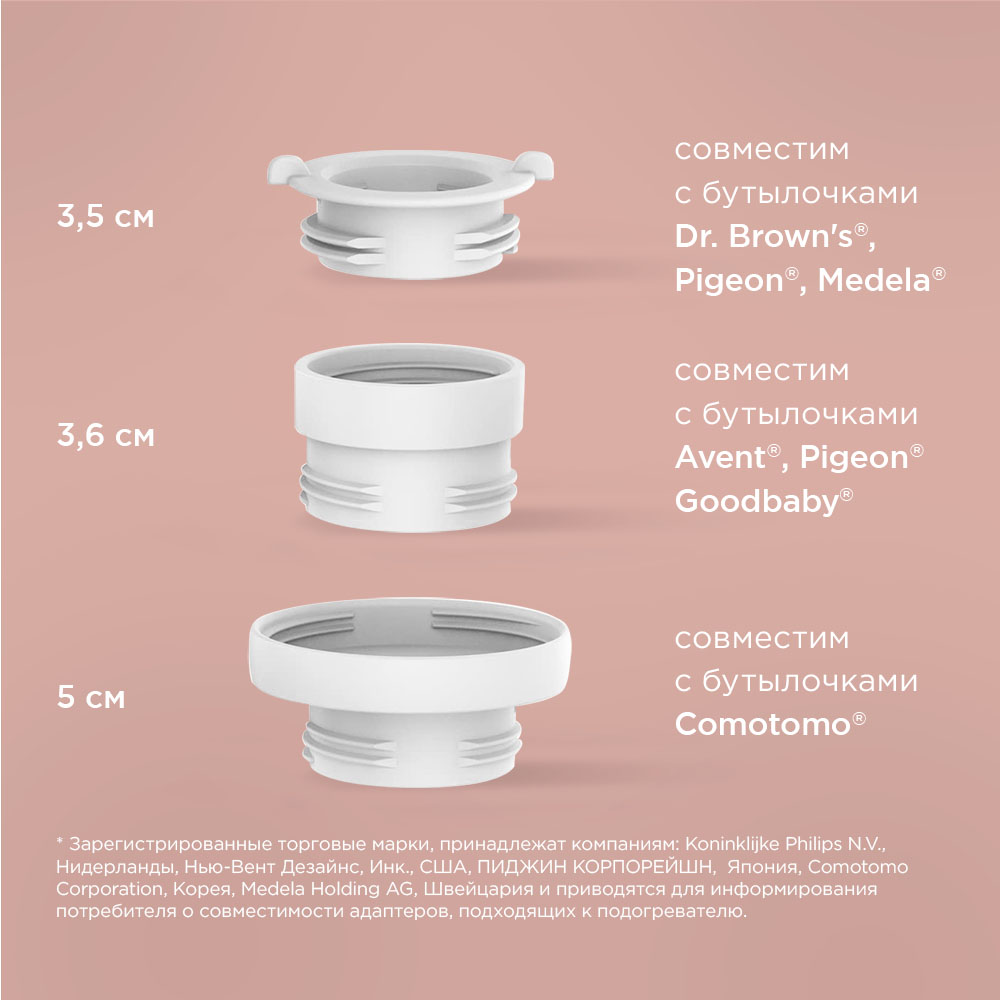 РЕДМОНД ВС5200 — портативный подогреватель молока, воды и детских смесей с 4 режимами нагрева, который понравится и молодым, и опытным мамочкам. Грудное молоко следует нагревать до 37 °С, а воду и детские смеси — до 40, 45 или 50 °С, ориентируясь на информацию на упаковке. Подогреватель заряжается от кабеля USB Type-C и держит заряд 5 часов, поэтому очень удобен для ночного кормления, прогулок и поездок. В комплекте 3 адаптера для бутылочек популярных брендов.