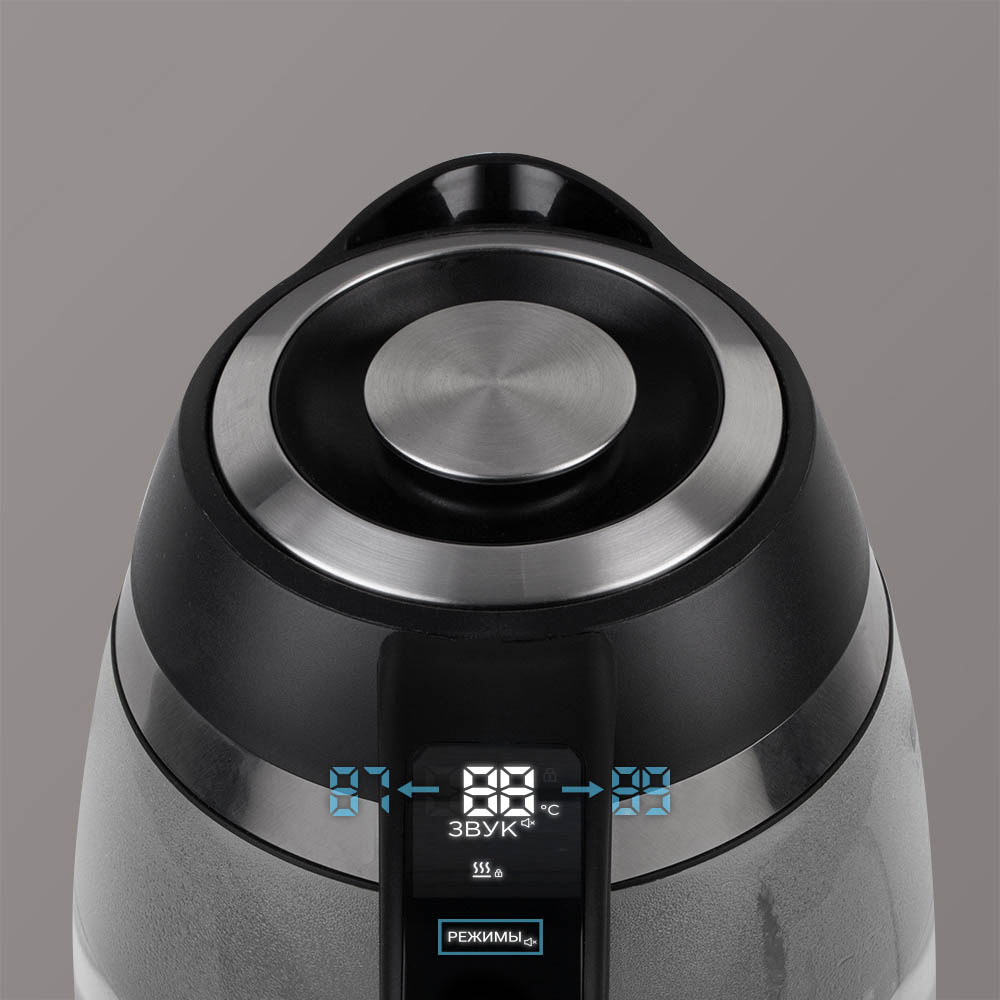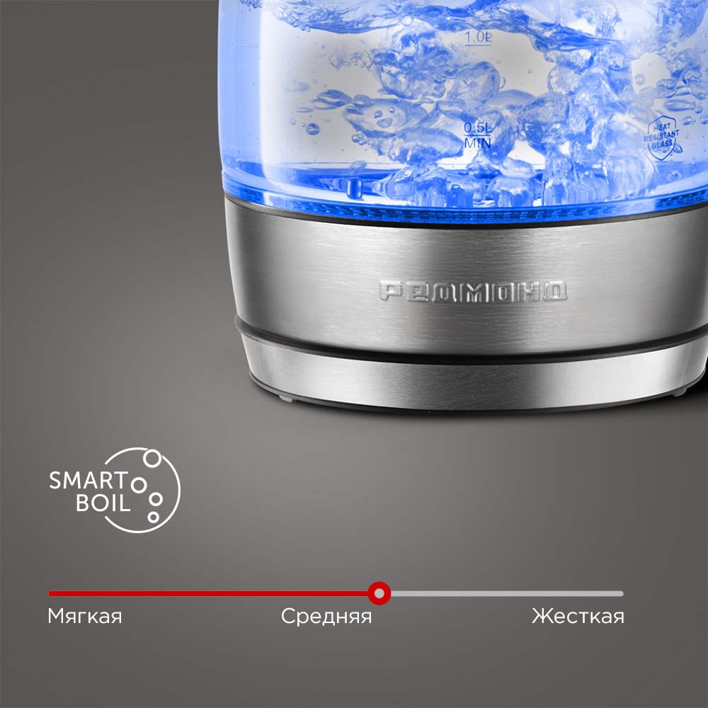 Умный чайник РЕДМОНД SkyKettle KG230S поддерживает управление со смартфона по Wi-Fi и оснащен удобным сенсорным управлением. Объем 1,7 л оптимален для 6–7 чашек горячих напитков. Мягкая разноцветная подсветка меняет цвет в зависимости от температуры воды и создает уютную атмосферу на кухне. Функция Smart Boil помогает смягчить воду, а надежная контактная группа Strix® отвечает за безопасность и долгий срок службы.