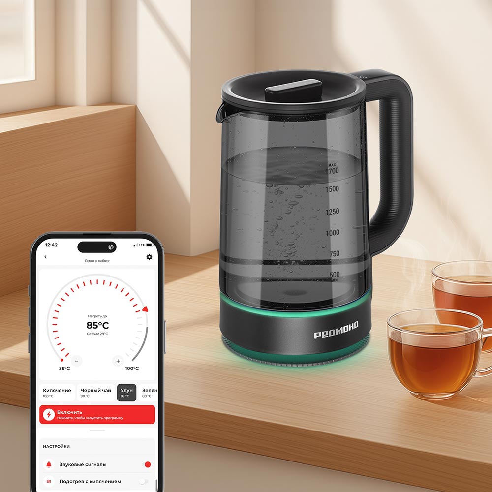 Умный чайник РЕДМОНД KG259S на 1,7 л поможет заварить различные сорта чая и приготовить детское питание. Регулируйте температуру с точностью до 1 °C в приложении Ready for Sky REDMOND. У чайника есть функция Smart Boil и поддержание температуры. Благодаря контактной группе Striх® он будет работать стабильно, а съемная крышка сделает уход удобным.