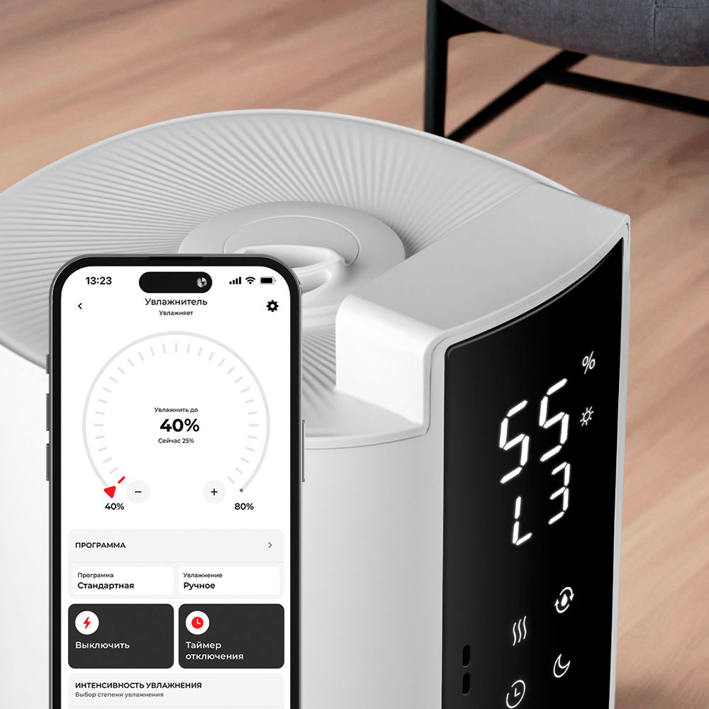 Умный увлажнитель воздуха РЕДМОНД HF2213S обеспечивает эффективное быстрое увлажнение — производительность 430 мл/ч позволяет поддерживать комфорт в помещениях до 40 кв. м. Благодаря резервуару на 9 л он работает до 72 часов, а 3 режима интенсивности и ручная настройка влажности дают полную свободу выбора параметров для вашего дома. Функция «Теплый пар» ускоряет увлажнение и способствует удалению бактерий, а встроенная УФ-лампа дополнительно обеззараживает воду. Функция ароматизации позволяет наполнить воздух любимым ароматом. Управление возможно через приложение R4S REDMOND, пульт ДУ или сенсорный дисплей. Таймер, ночной режим (до 35 дБ) и подсветка уровня воды делают использование максимально удобным.