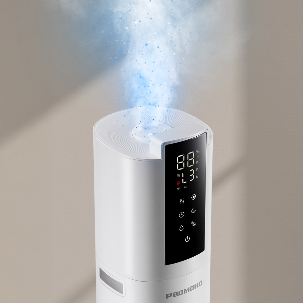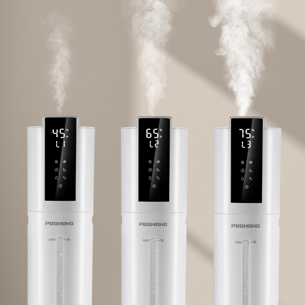 Умный увлажнитель воздуха РЕДМОНД HF2213S быстро повышает уровень влажности в помещении. Благодаря производительности 430 мл/ч прибор эффективно поддерживает комфортный микроклимат на площади до 40 кв. м. С резервуаром на 9 л он работает до 72 часов, а 3 режима интенсивности и ручная настройка влажности дают полную свободу выбора параметров для вашего дома. Функция «Теплый пар» ускоряет увлажнение и способствует удалению бактерий, а встроенная УФ-лампа дополнительно обеззараживает воду. Функция ароматизации позволяет наполнить воздух любимым ароматом. Управление возможно через приложение R4S REDMOND, пульт ДУ или сенсорный дисплей. Таймер, ночной режим (до 35 дБ) и подсветка делают использование максимально удобным.