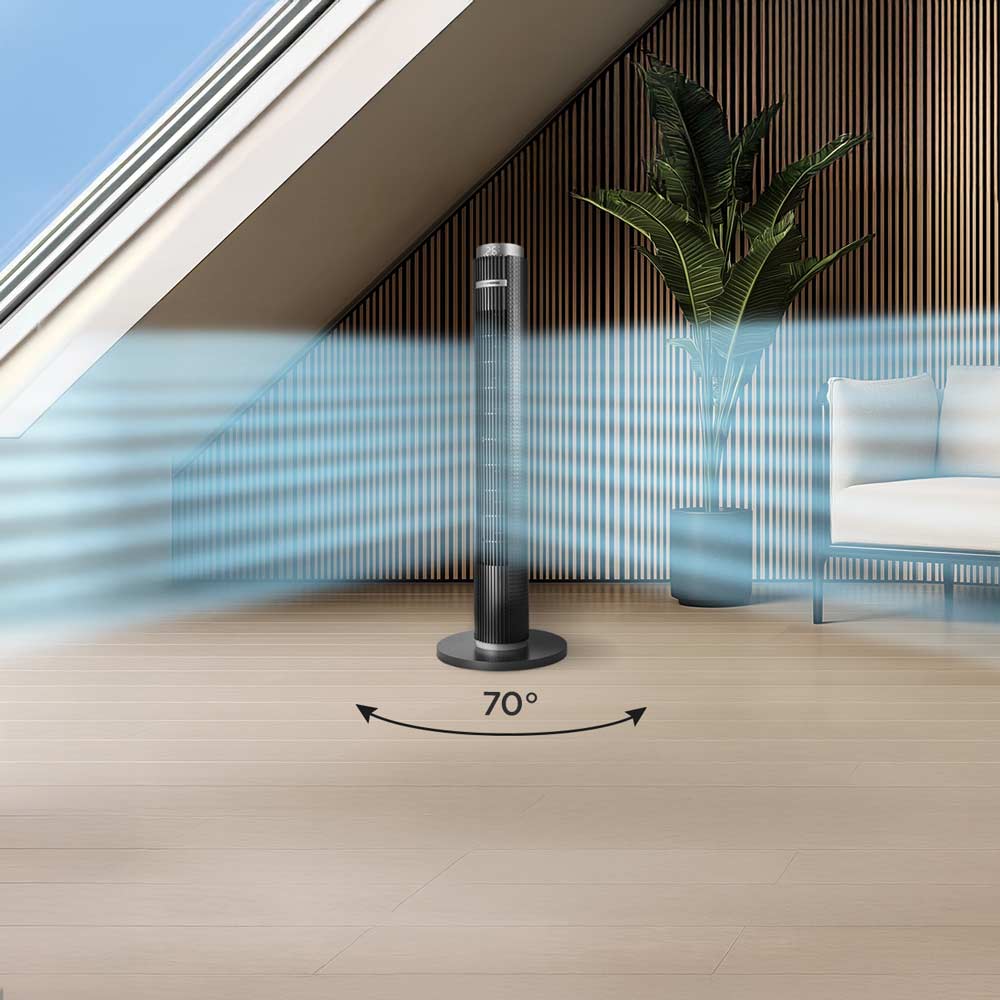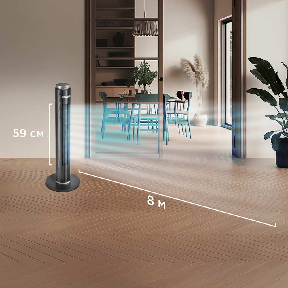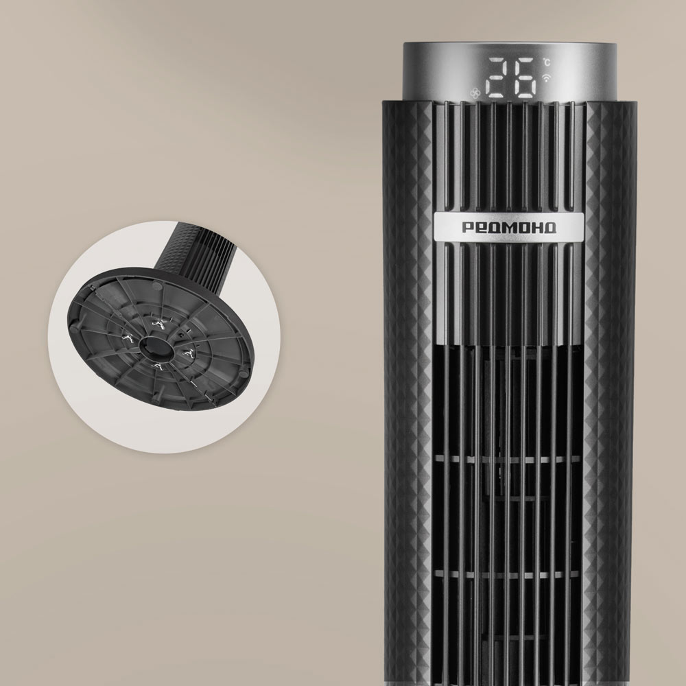 РЕДМОНД AP2215S — умный напольный вентилятор с удаленным доступом через мобильное приложение Ready for Sky REDMOND. С расстоянием обдува 8 метров и размером воздуховода 59 см модель может быстро охладить большую площадь в квартире или в частном доме. Таймер позволяет настроить проветривание на 1–12 часов. А благодаря низкому уровню шума 43 дБ вентилятор не помешает во время сна, отдыха или работы.